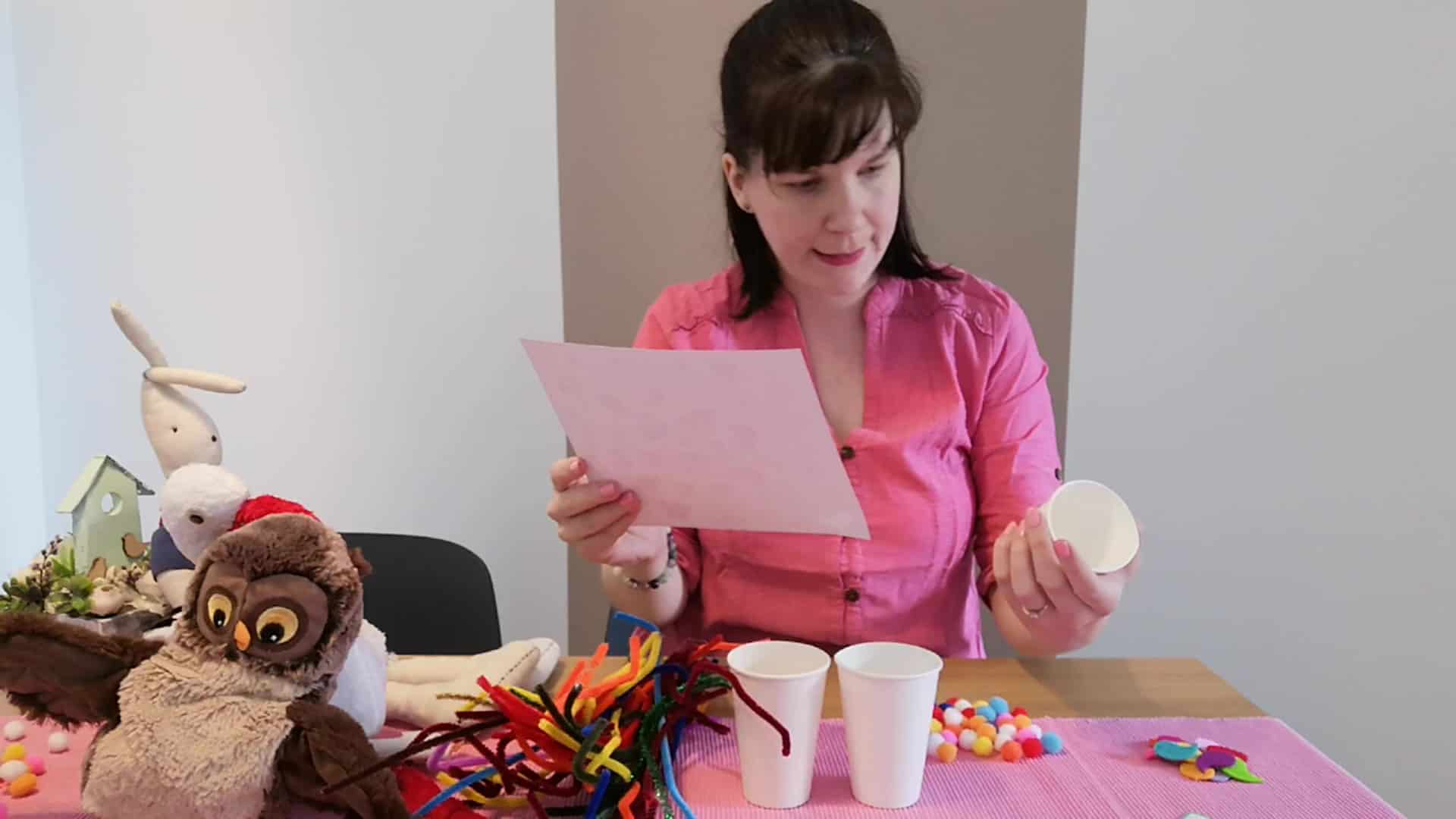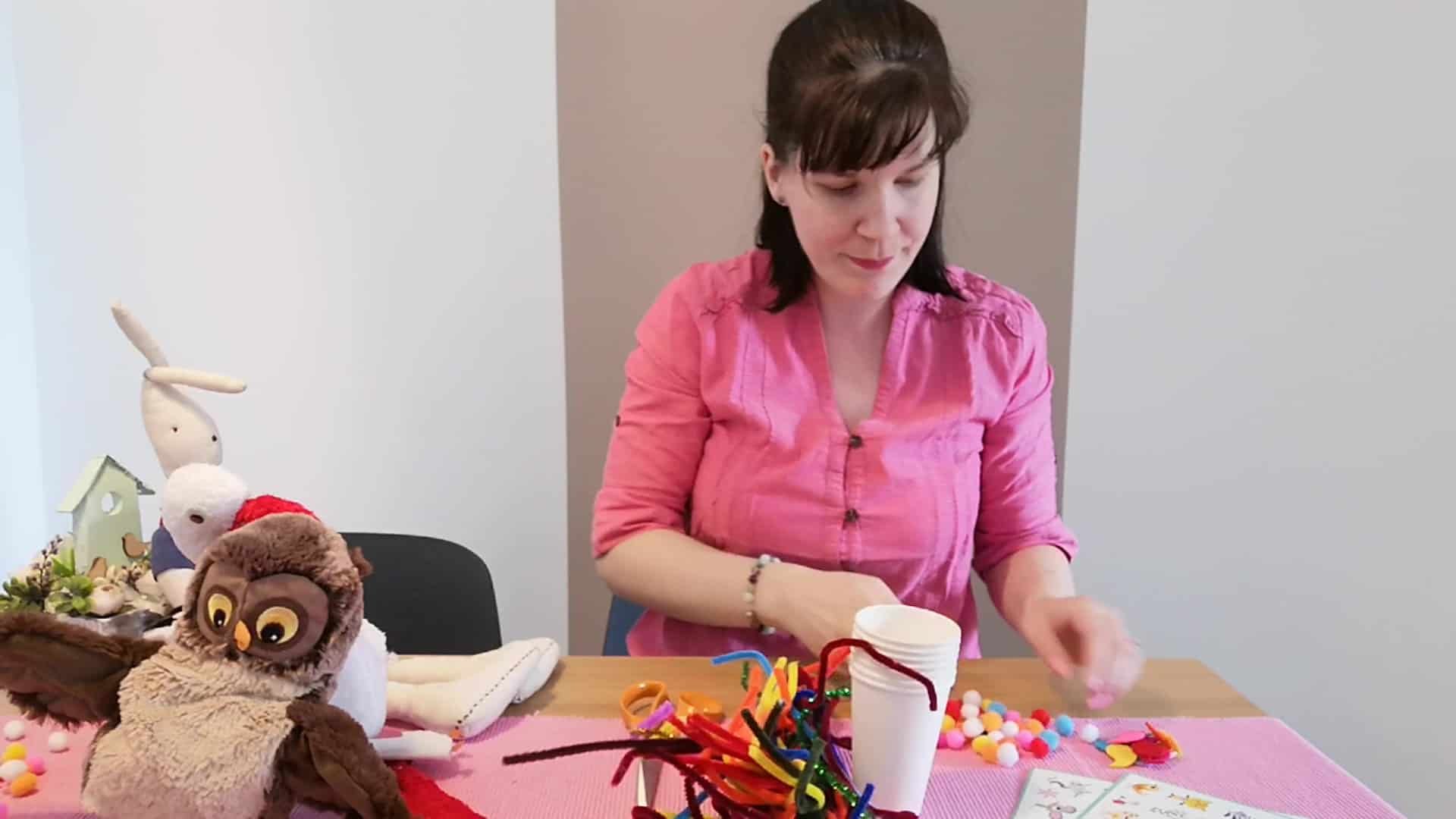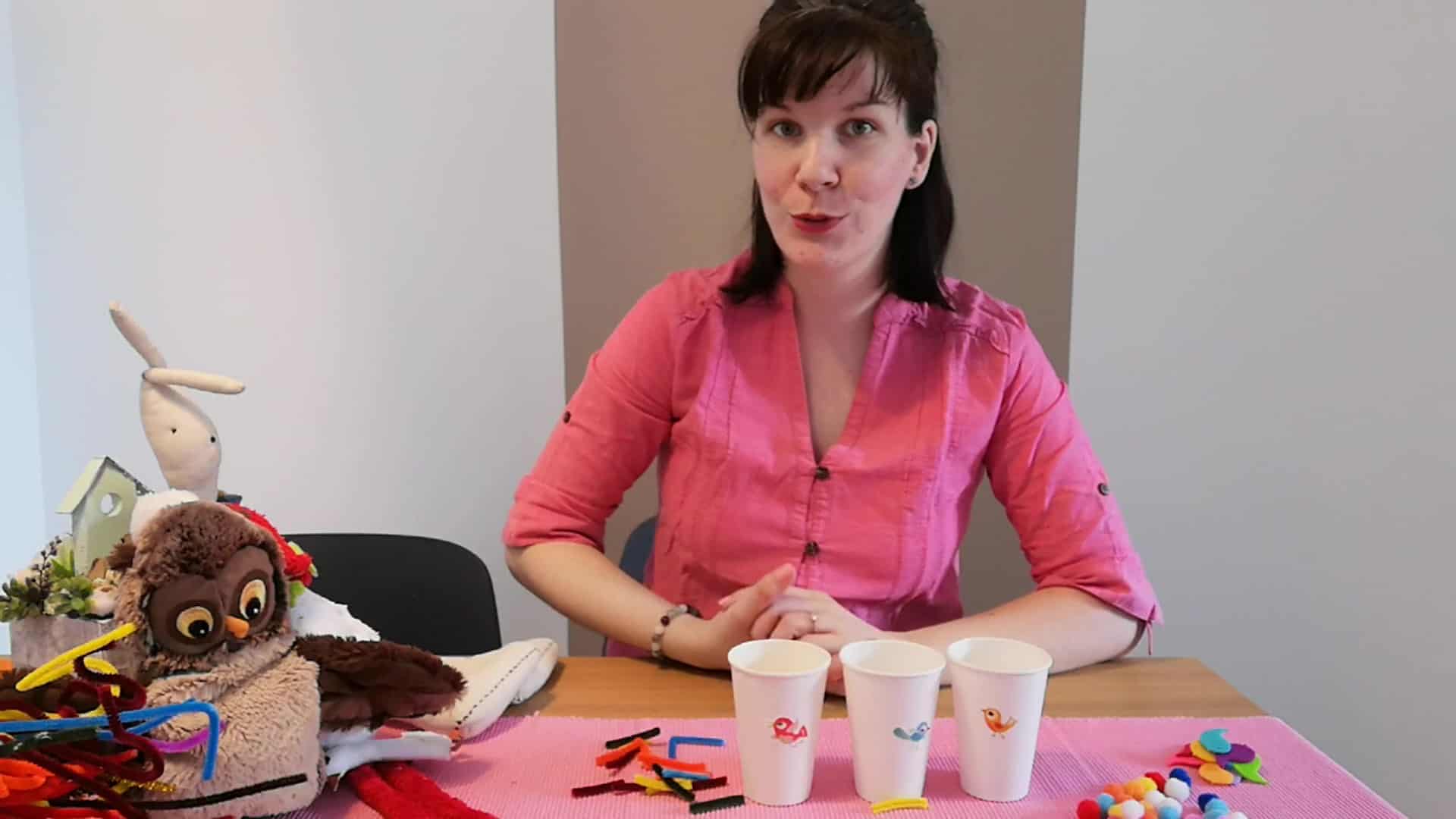 A játék során a kezünkből anyamadár csőrt formázva gyűjtjük be a falatokat, és osztjuk szét azokat a poharakra ragasztott kicsi fiókák között. 🙂