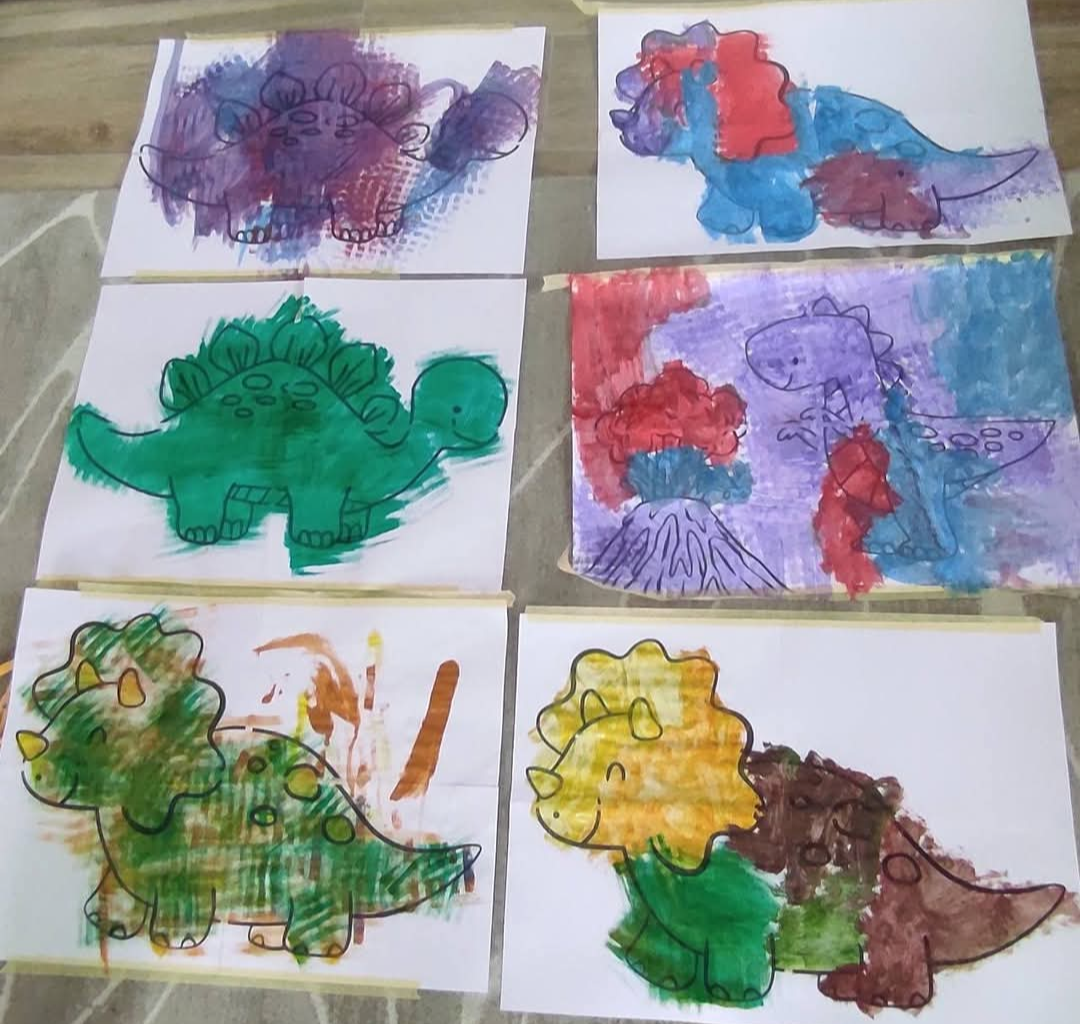 Már egészen ici-picikkel is kipróbálhatjátok mókás, dínós óriás színezőnket, amelynek színessé varázsolásához mindenféle technikát bevethettek. A legkisebbek számára a puha, könnyen kezelhető, jól marokra fogható eszközök és alapanyagok az ideálisak, így a legjobb a kézzel, vastag ecsettel vagy akár jégkockával festés technikája.
