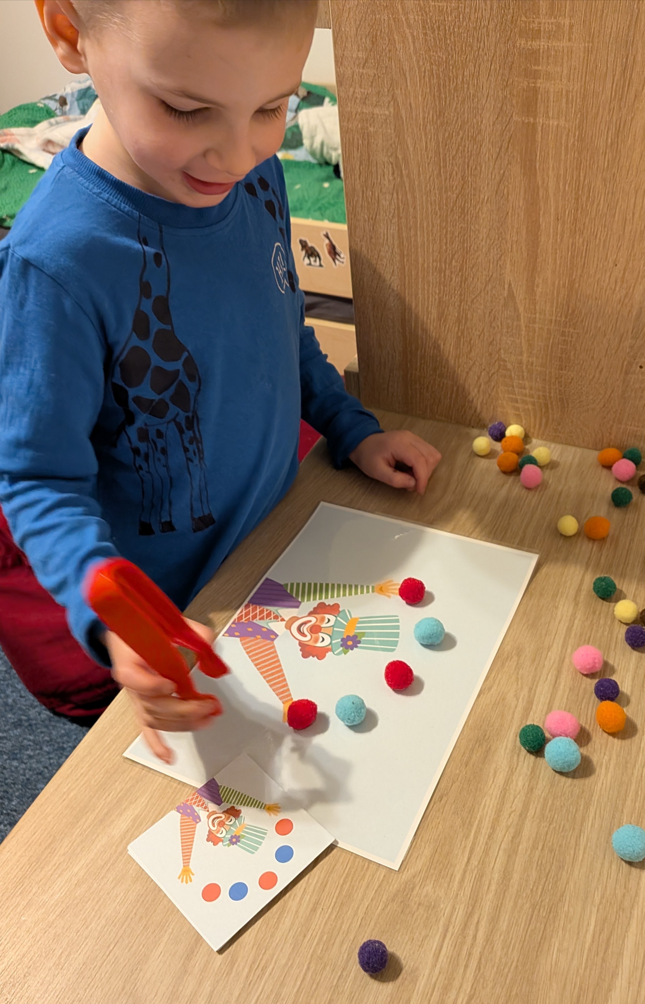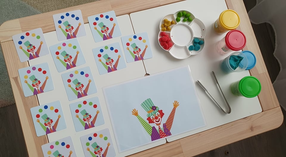A játék célja: Helyezzétek el a színes „labdákat” a bohóc feje fölé a kártyákon látható színsorok szerint. A kis labdák lehetnek gyurmából, krepp papírból vagy akár színes pompomokkal, gombokkal is dolgozhattok.