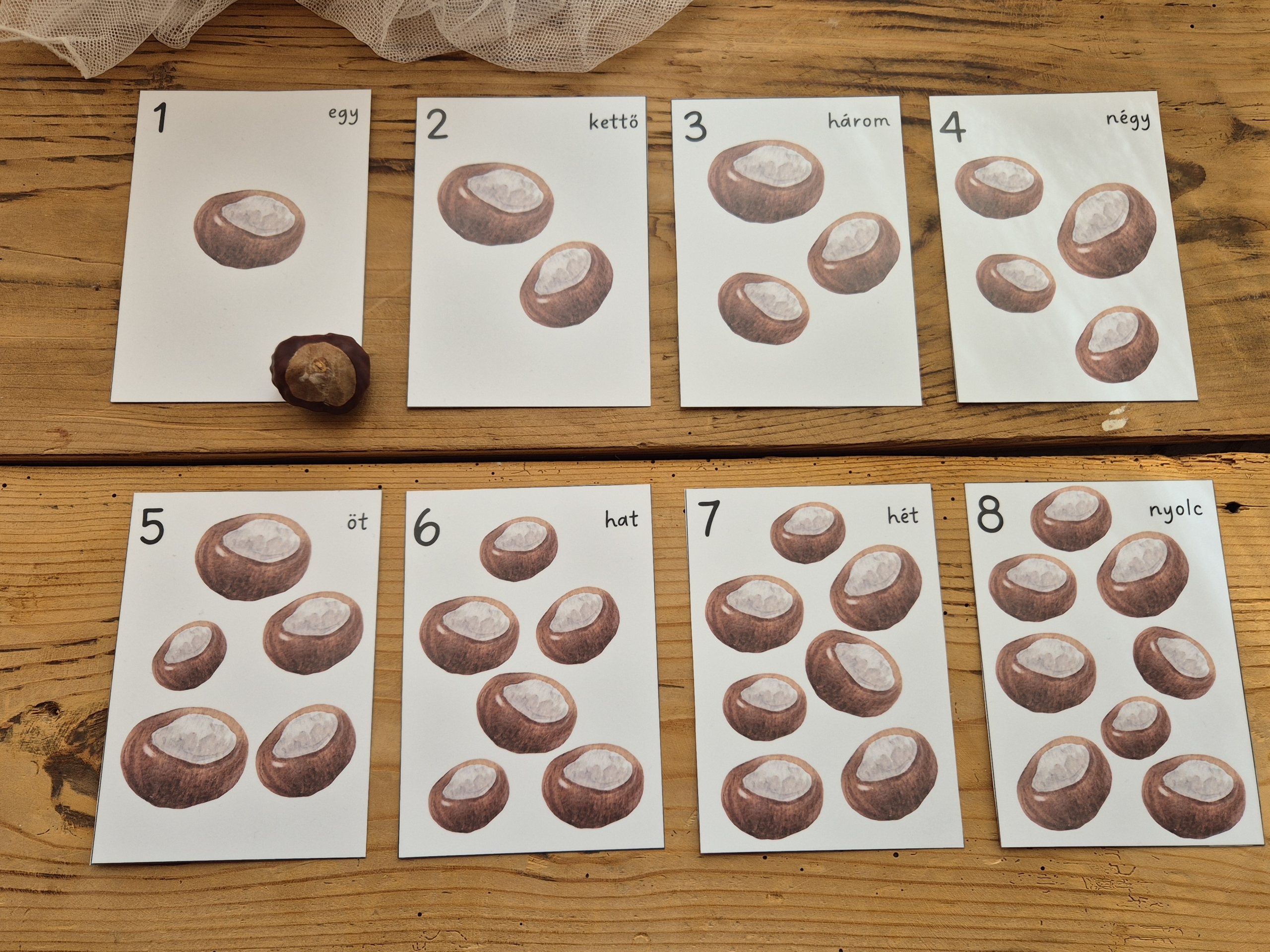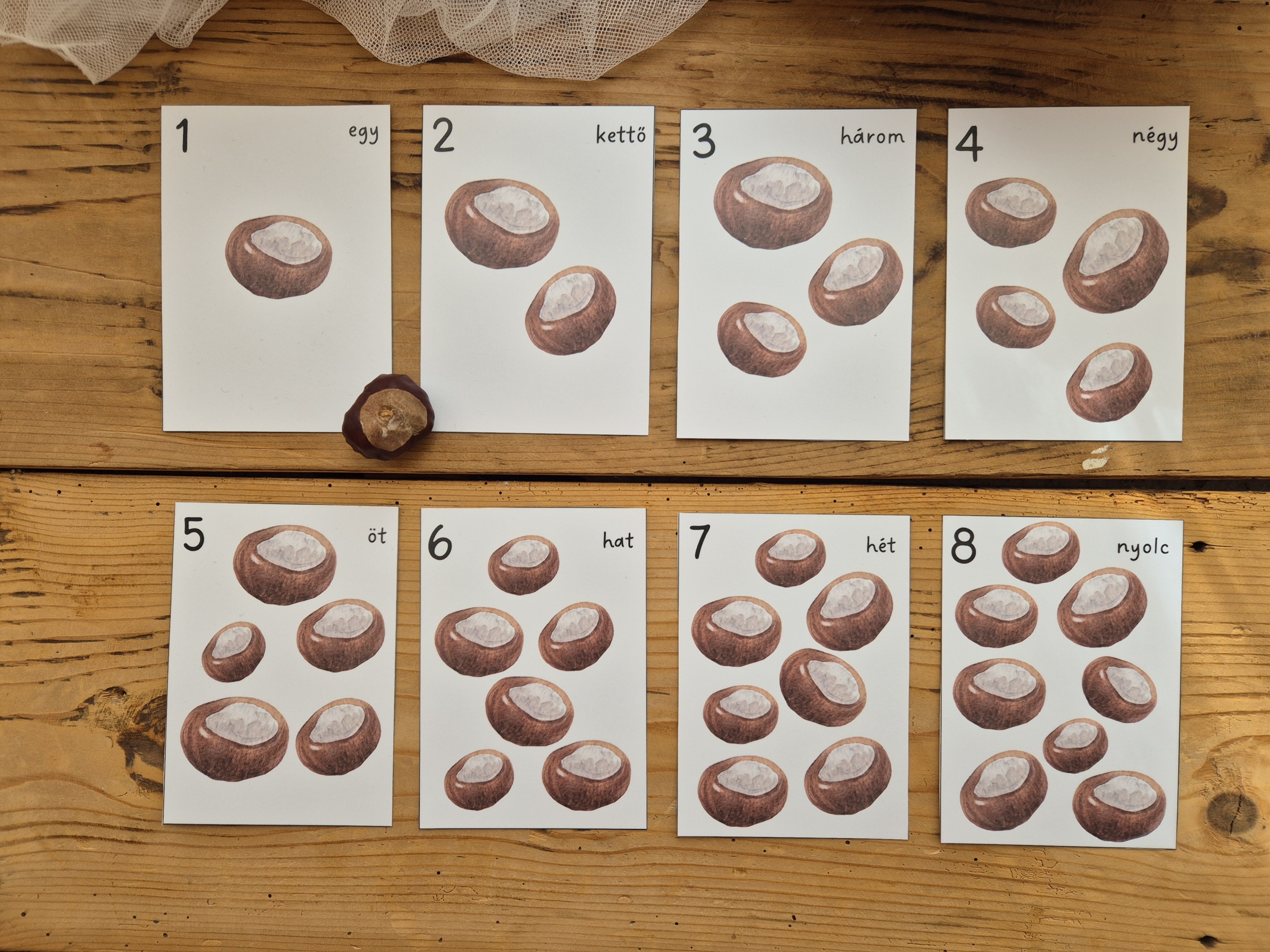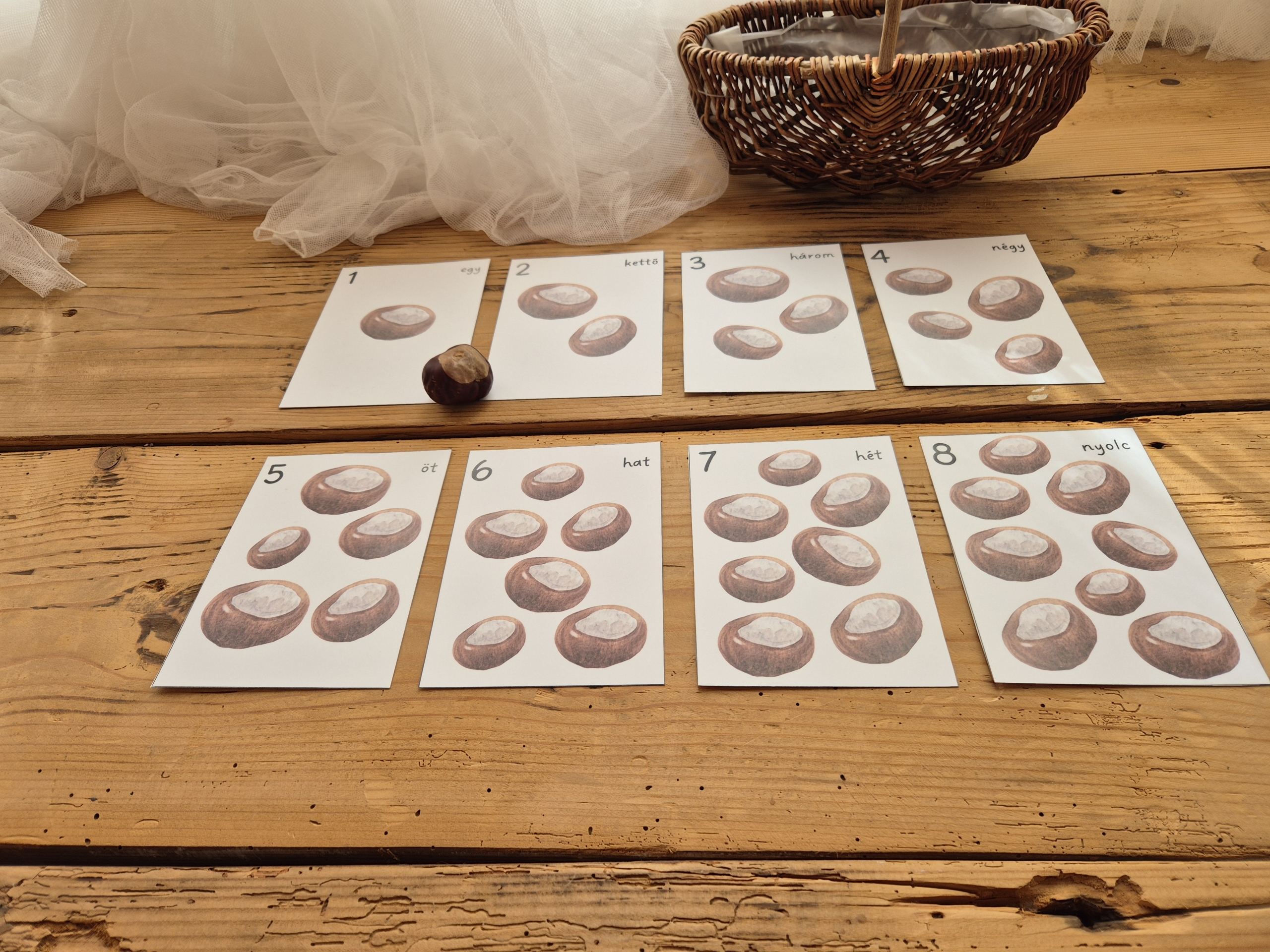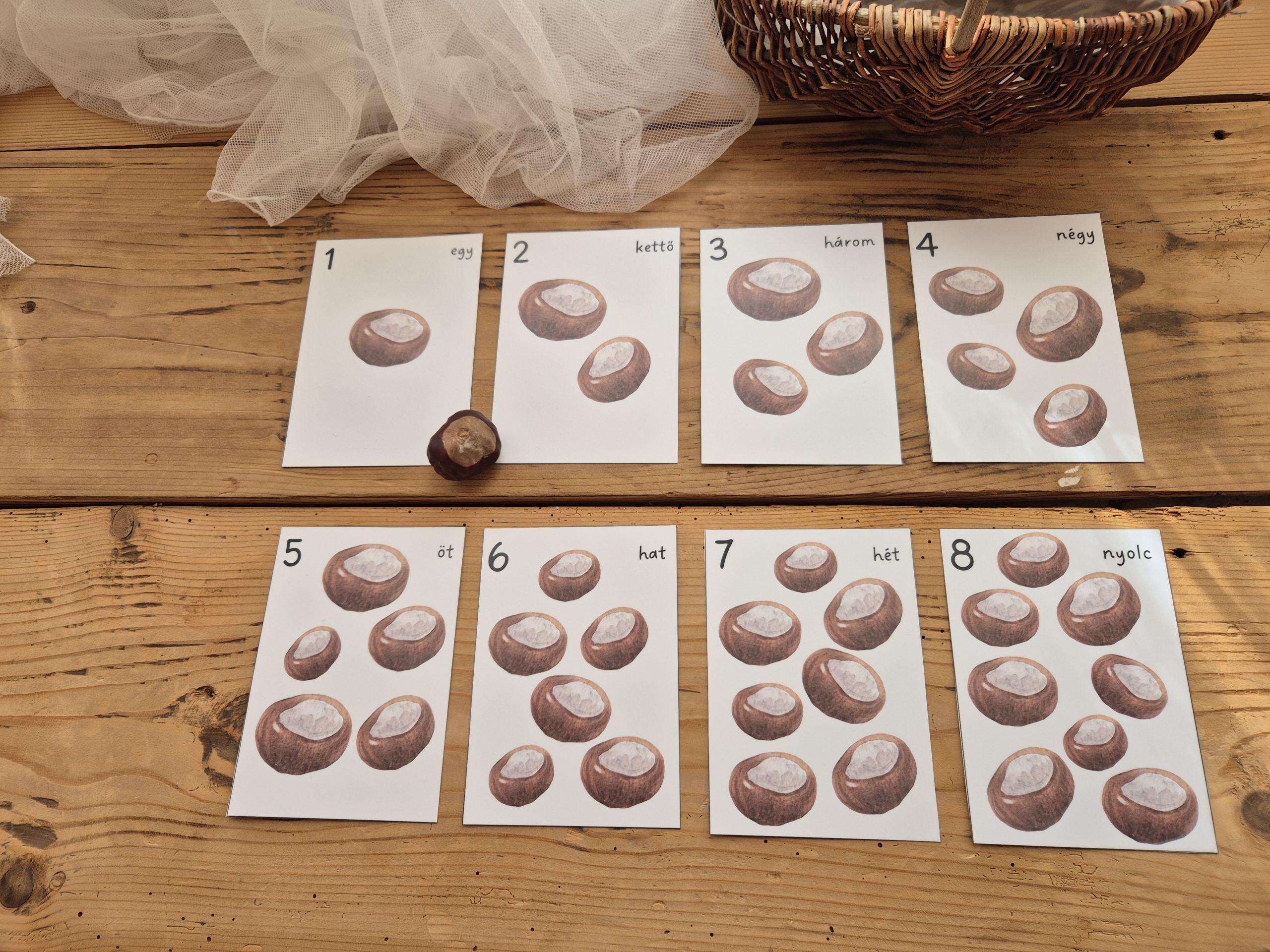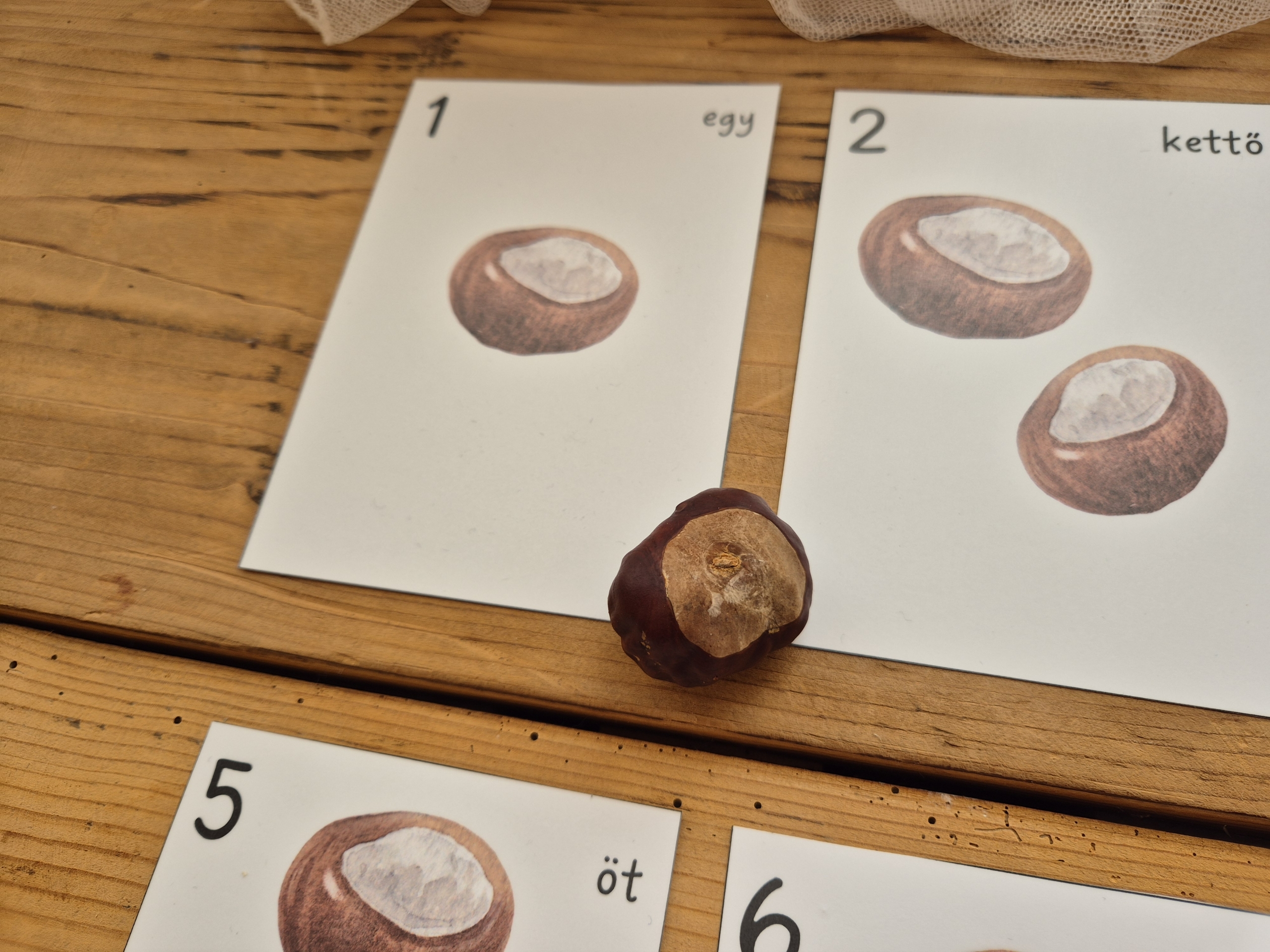 Az őszi időszakban annyi gesztenye hullik a földre, hogy ez mindenképpen egy számolókártya csomagért kiált! Hiszen rakosgatás közben ügyesen megtanulhatjuk a számok neveit és leírt megfelelőjét is, közben pedig még gyermeked finommotorikája és szem-kéz koordinációja is fejlődik.