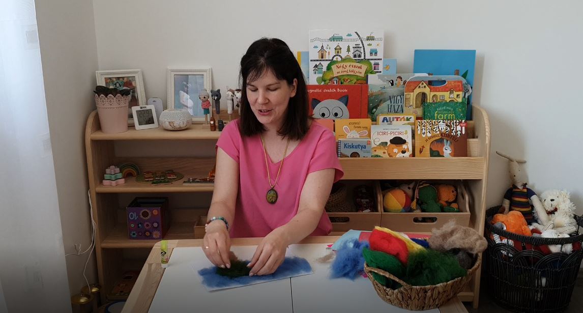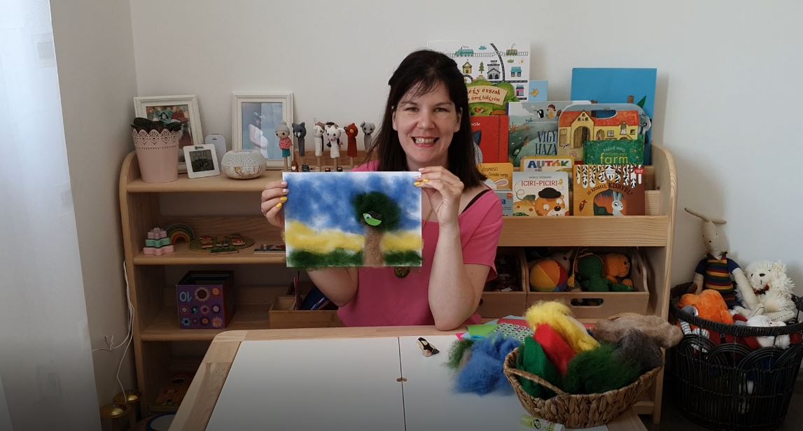 Ehhez az alkotáshoz ezúttal természetes gyapjút használtunk fel, amelyet a ragasztás technikájával varázsoltunk erdei képpé. :)