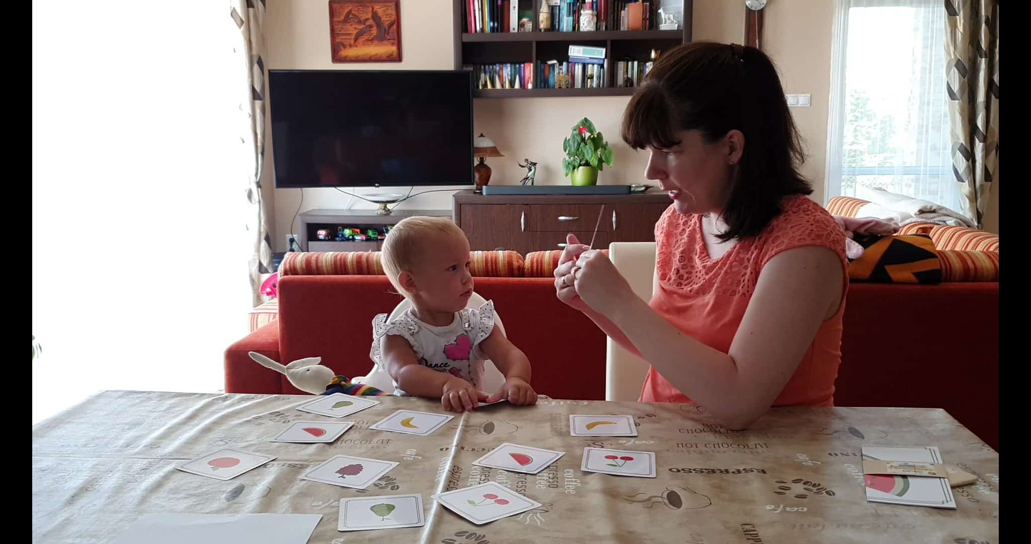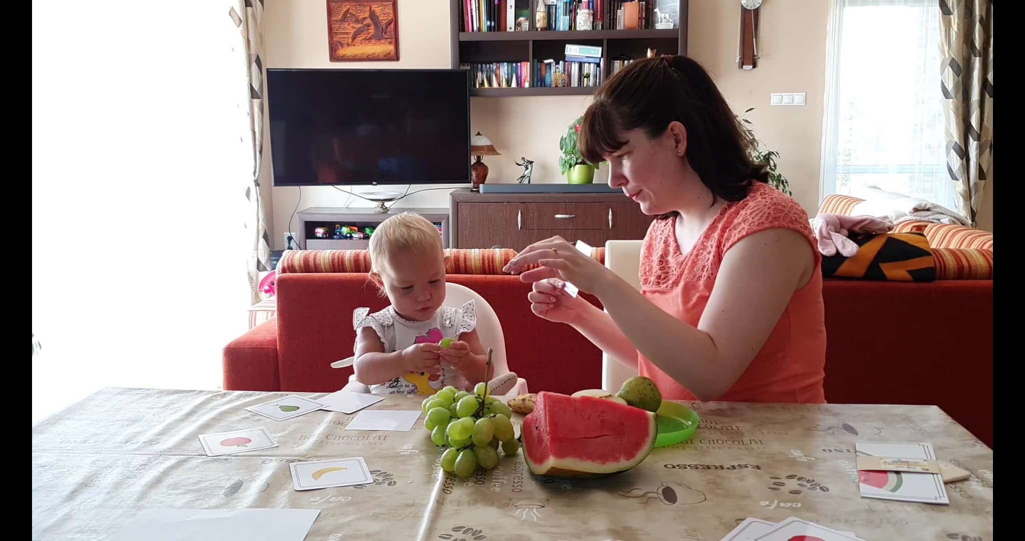 Érdemes megfigyelni azt, ahogyan elindulunk a videóban onnan, hogy párosítsa össze, ismerje fel a gyümölcsöket, majd amikor látjuk, hogy még picit nagy falat, hogyan jutunk el a gyümölcsök kóstolgatásáig, tapintásáig. :) Illetve azt, ahogyan Evelin figyel, és magába szívja a közben elhangzó információkat. :)