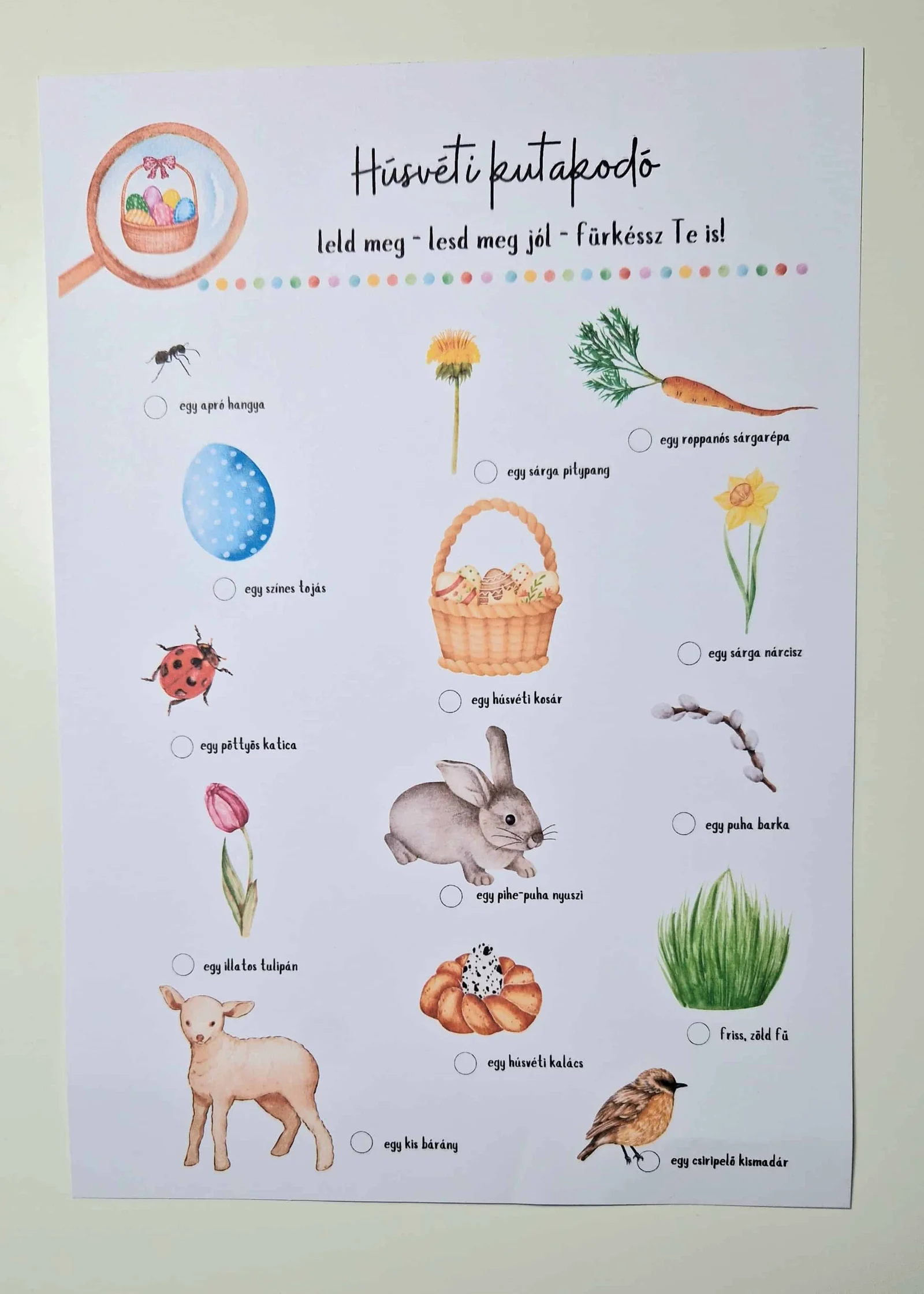 Mennyi kincset rejt a Húsvéti vadon? Megtaláljátok a hímes tojást vagy épp a pici hangyát? Figyeljetek nagyon, leljétek meg és pipáljátok ki a lapon, amit megtaláltatok! Ha lehetőségetek van tapintsátok is meg a megtalált dolgokat!