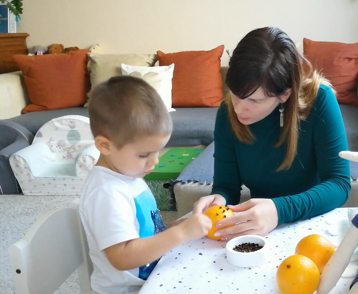 2 éves kortól: Lyukaszd elő a narancsot egy saslikpálca segítségével, majd abba böködje bele gyermeked a szegfűszegeket.