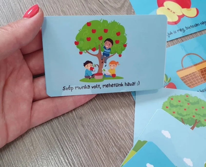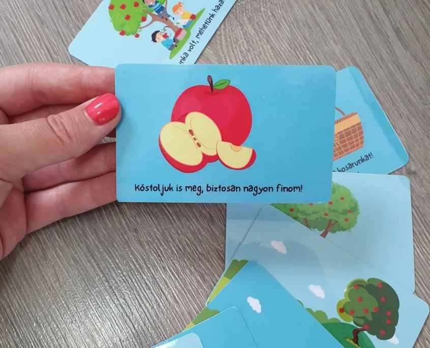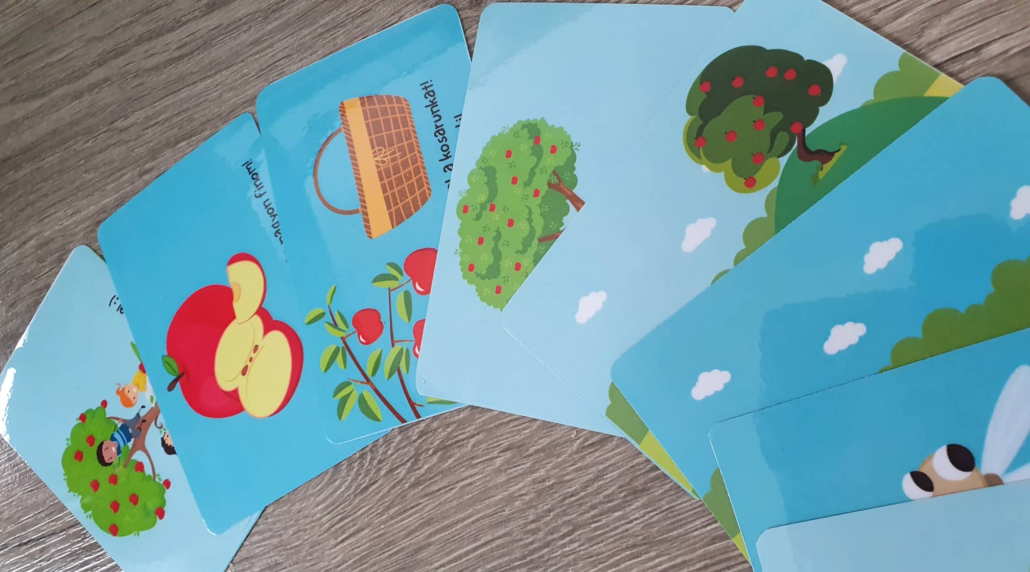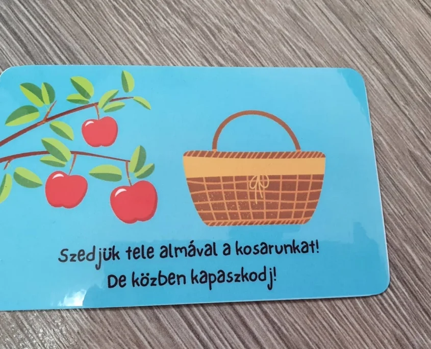 Csak töltsétek le a mellékelt kártyákat, tegyétek őket egymás mellé, majd kövessétek az utasításokat és szórakozzatok egy jót! Mert mozogni esős, hideg időben is jó és ilyen kártyákkal pedig igazán szórakoztató is a mozgás és az almaszüret.