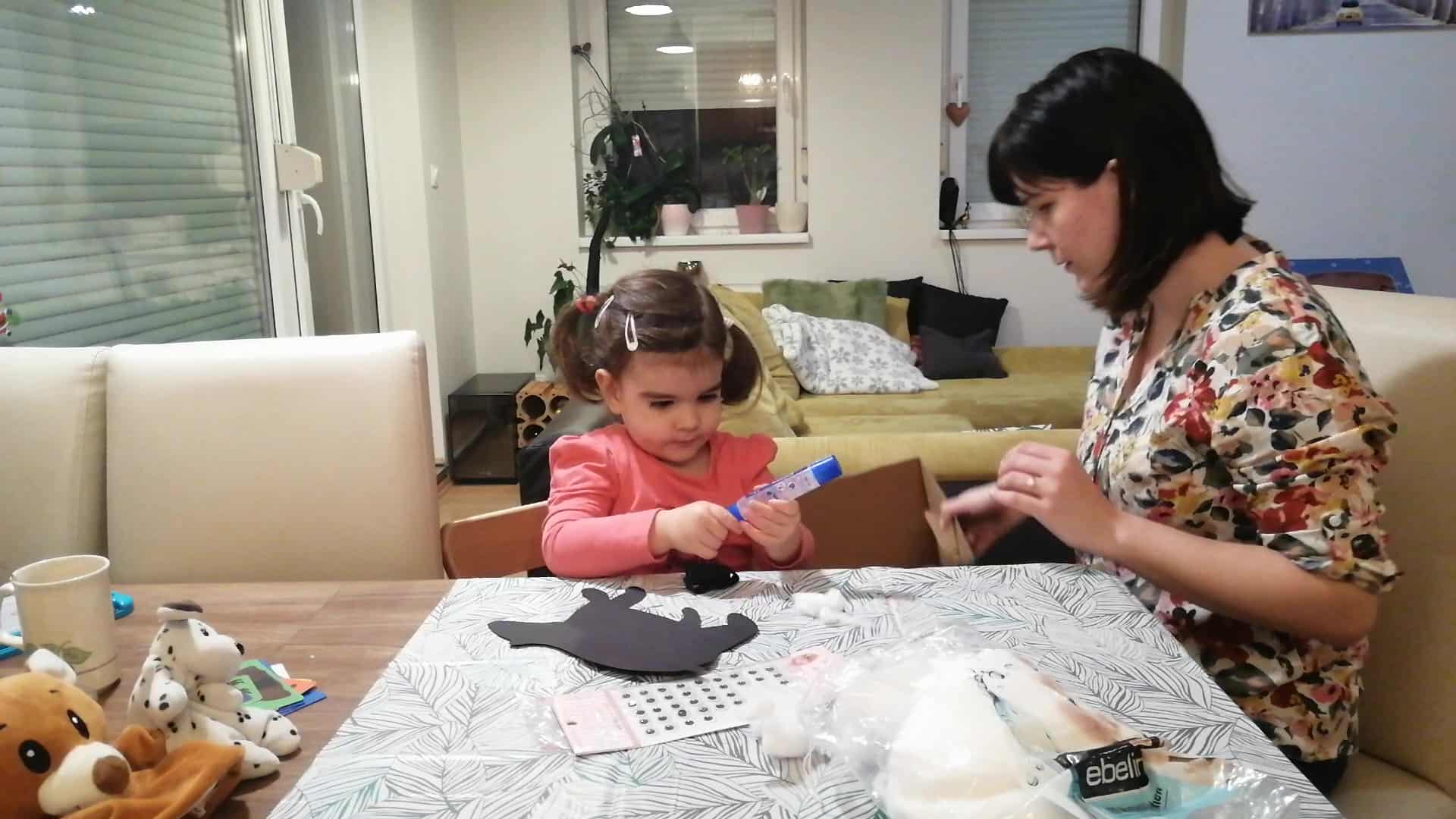 Felhasznált anyagok: nyomtatott sablon, vagy fekete kartonból kivágott maciforma, vatta, szemecske és ragasztó;