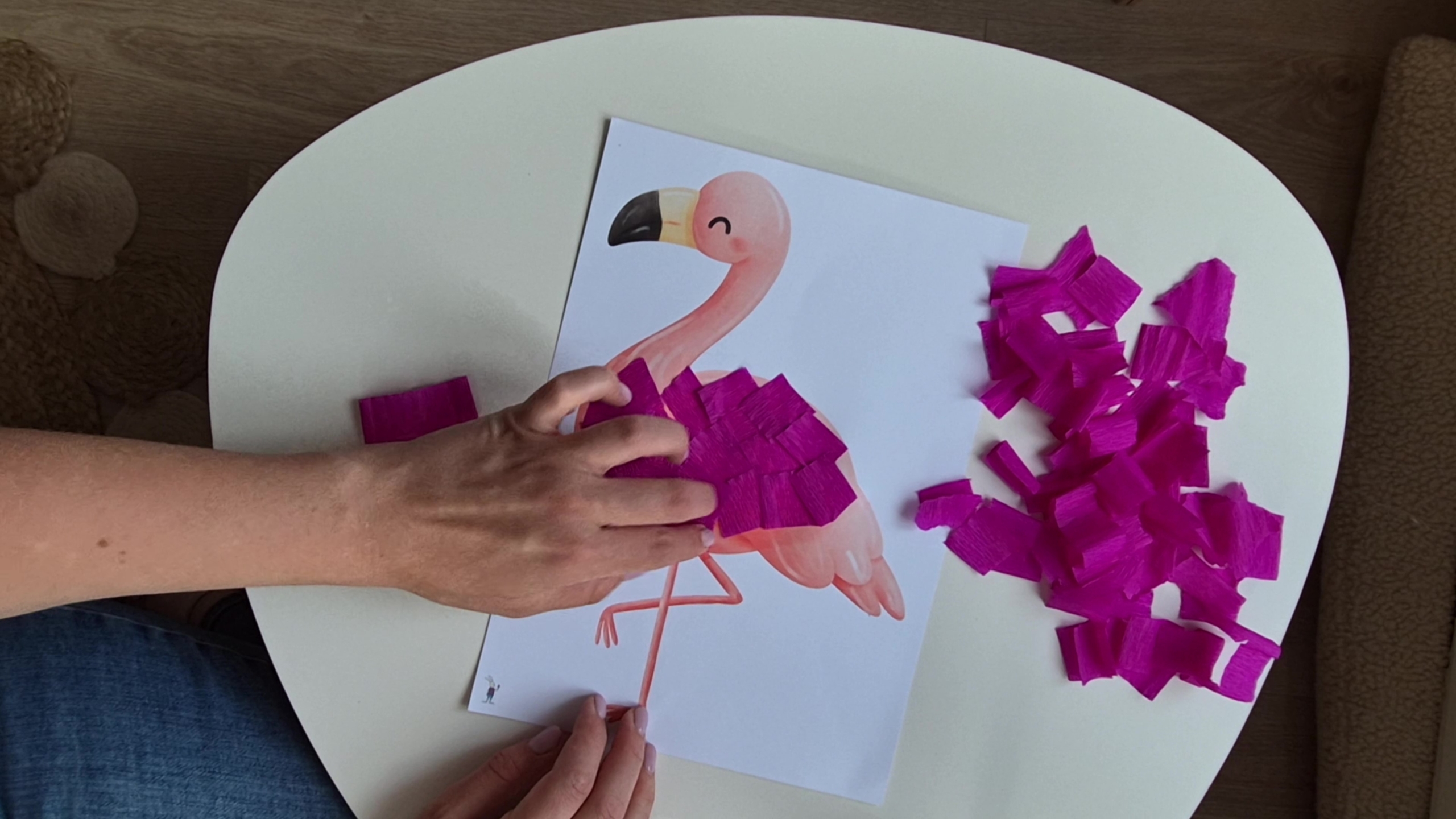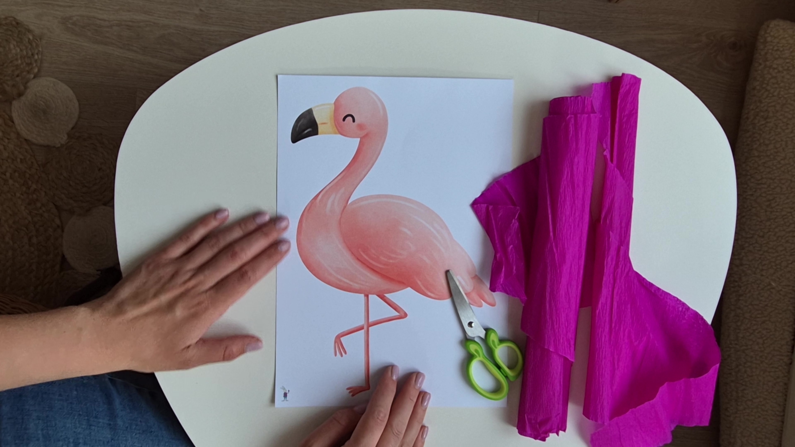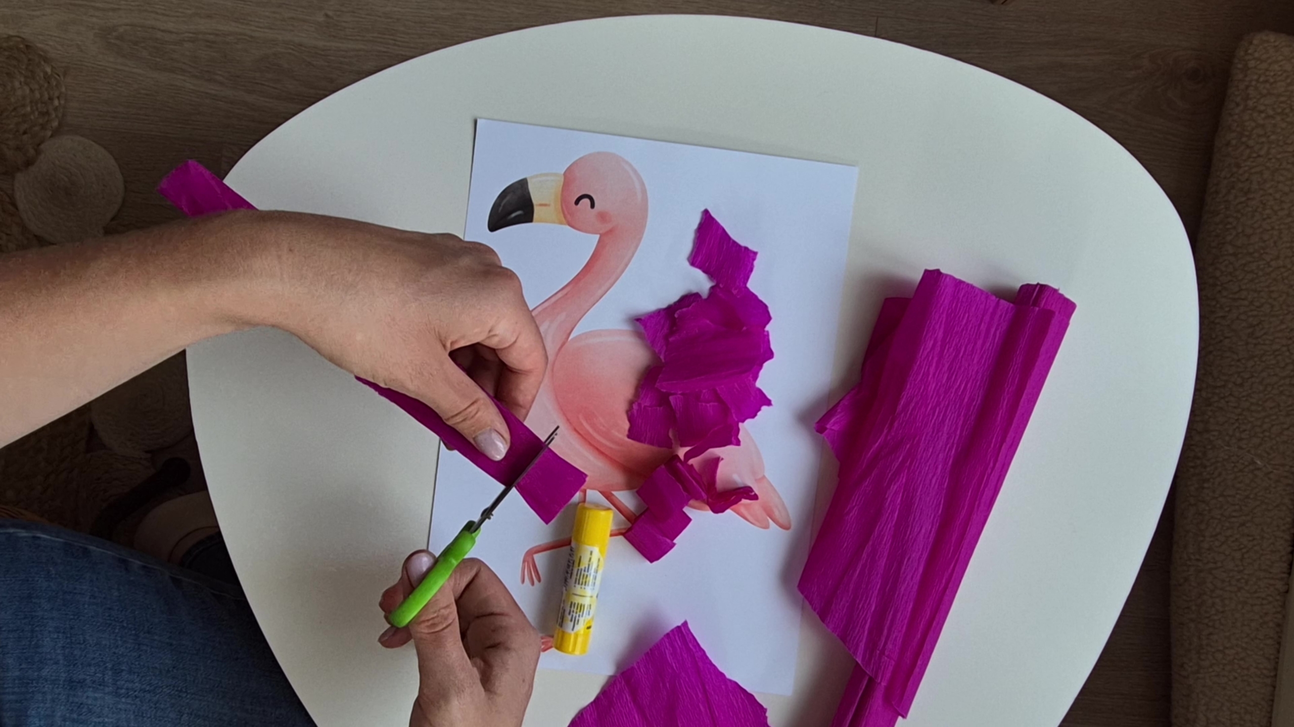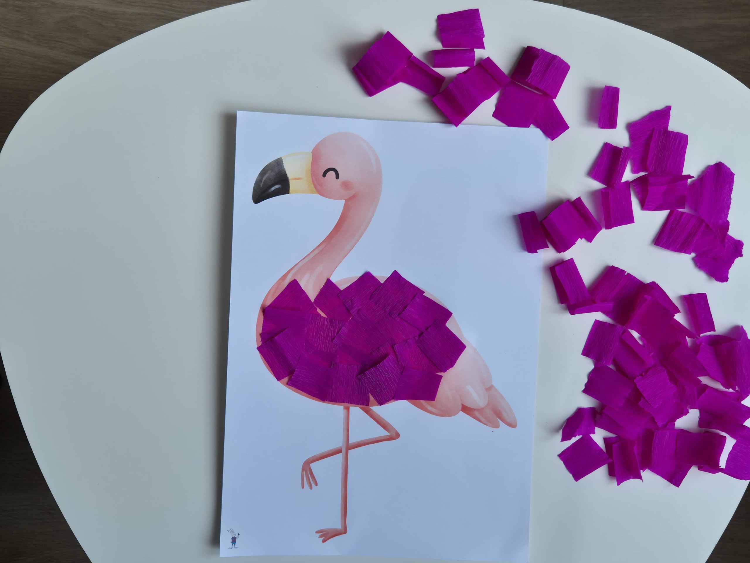 Már egészen picik is megpróbálkozhatnak ennek a mókás flamingónak az elkészítésével. Lehet közben tépkedni, gyűrni, ragasztani, odasimítani a kis krepp darabkákat. A nagyobbak pedig már önállóan vághatják fel a flamingónak valót.