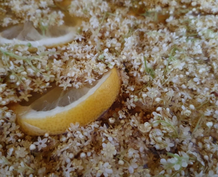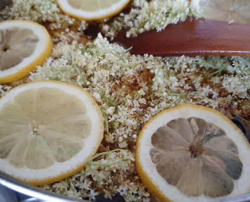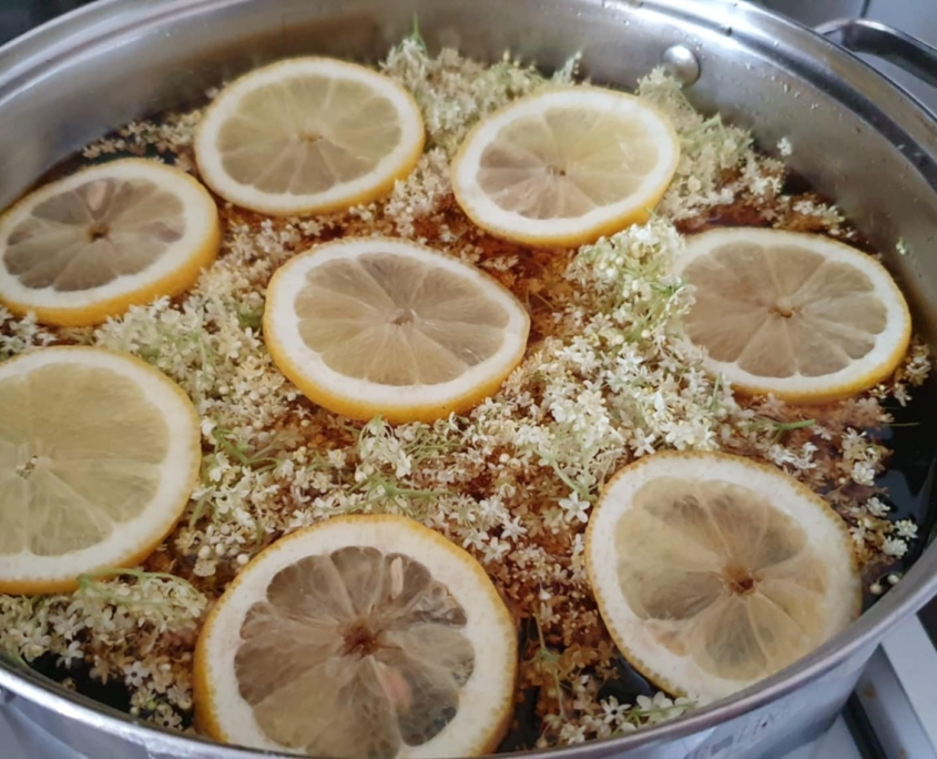 Amikor már csak szobahőmérsékletű, akkor beletesszük az aszkorbinsavat/ citromsavat, a virágokat és a citromkarikákat is.