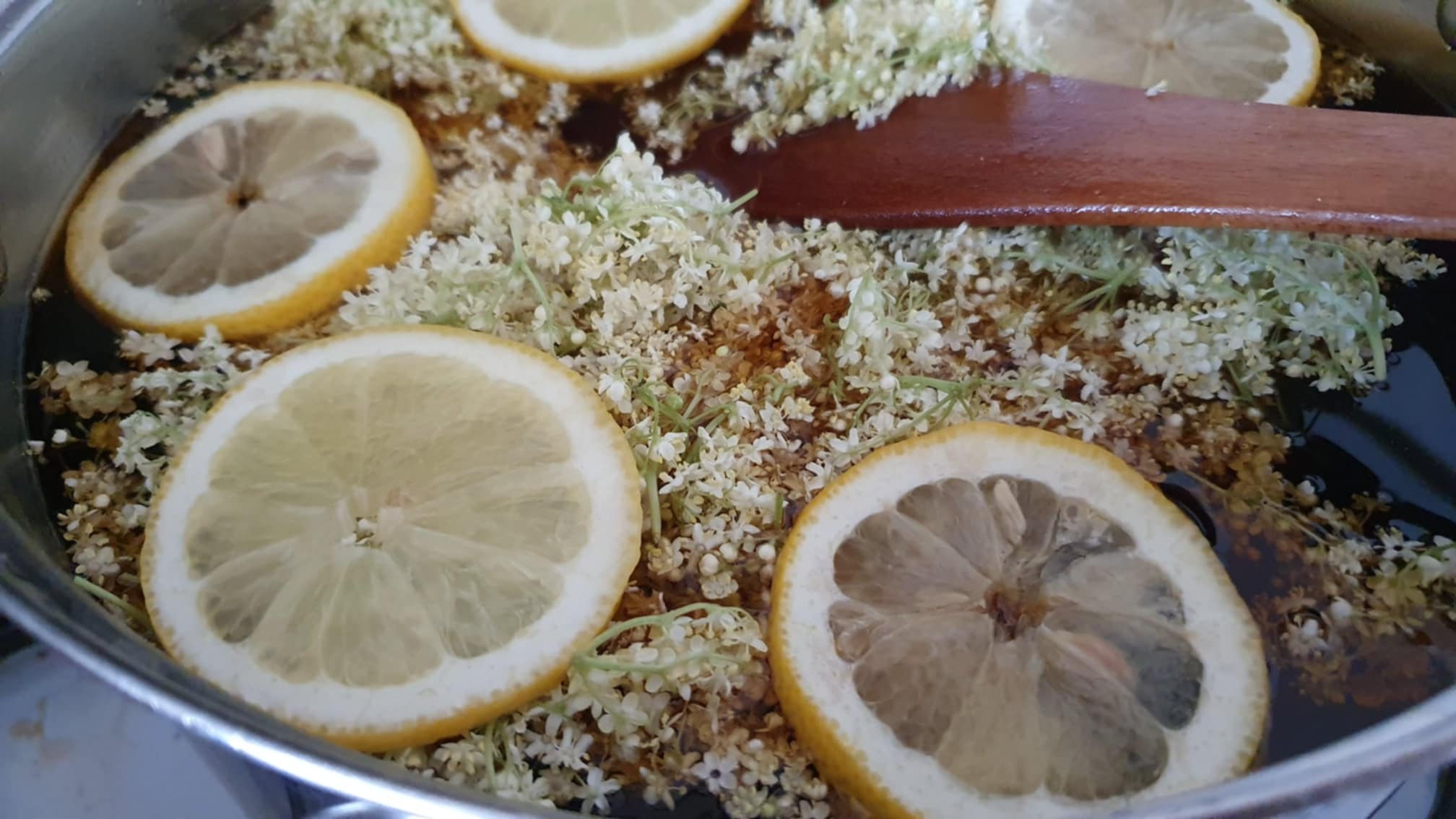Amikor már csak szobahőmérsékletű, akkor beletesszük az aszkorbinsavat/ citromsavat, a virágokat és a citromkarikákat is.