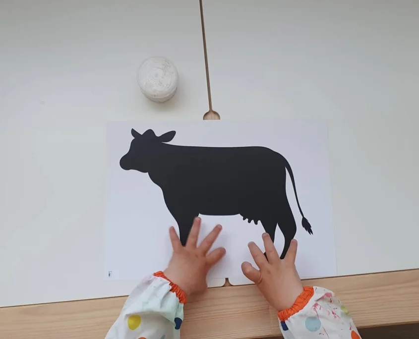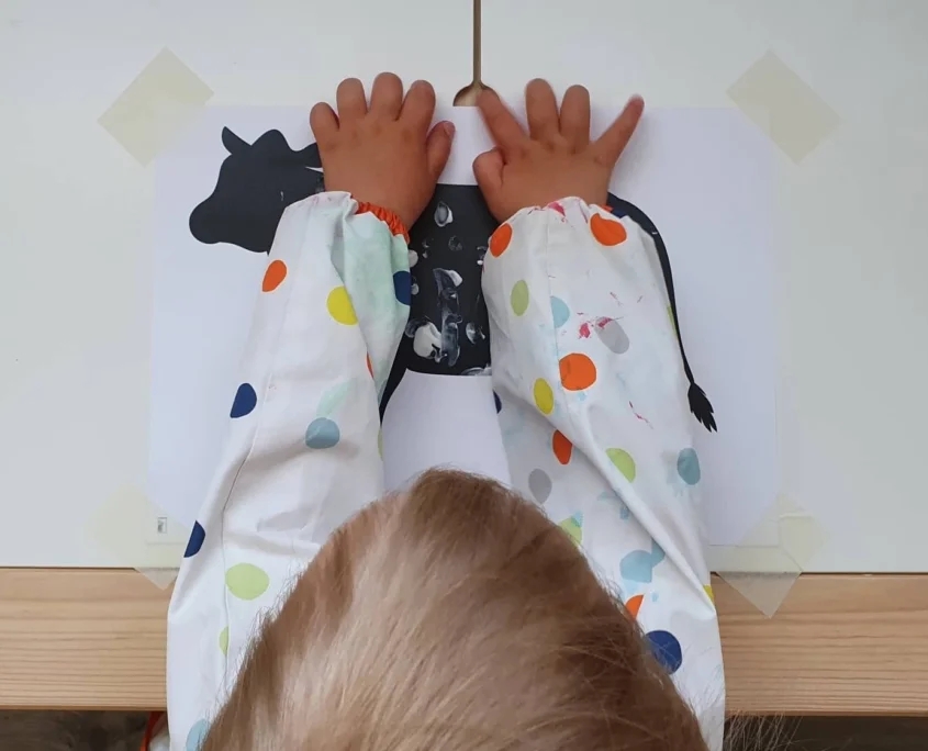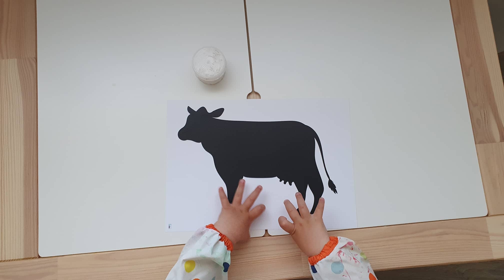2. És már adtam is Panninak, aki ujjfestéssel szépséges pöttyöket és foltokat varázsolt a tehenünkre. Ennyi. Egyszerű és nagyszerű alkotós móka! Készítsétek el Ti is! :)