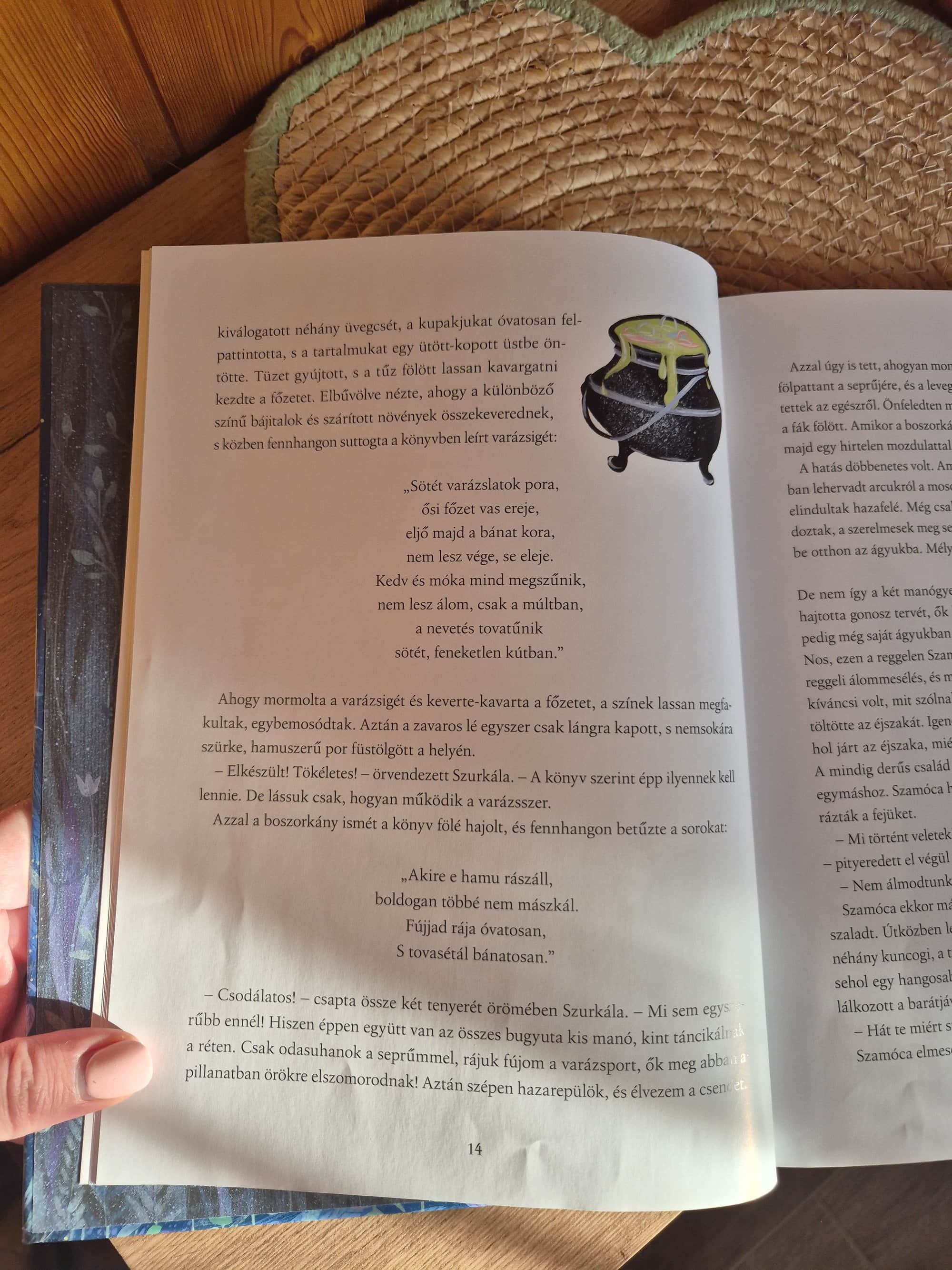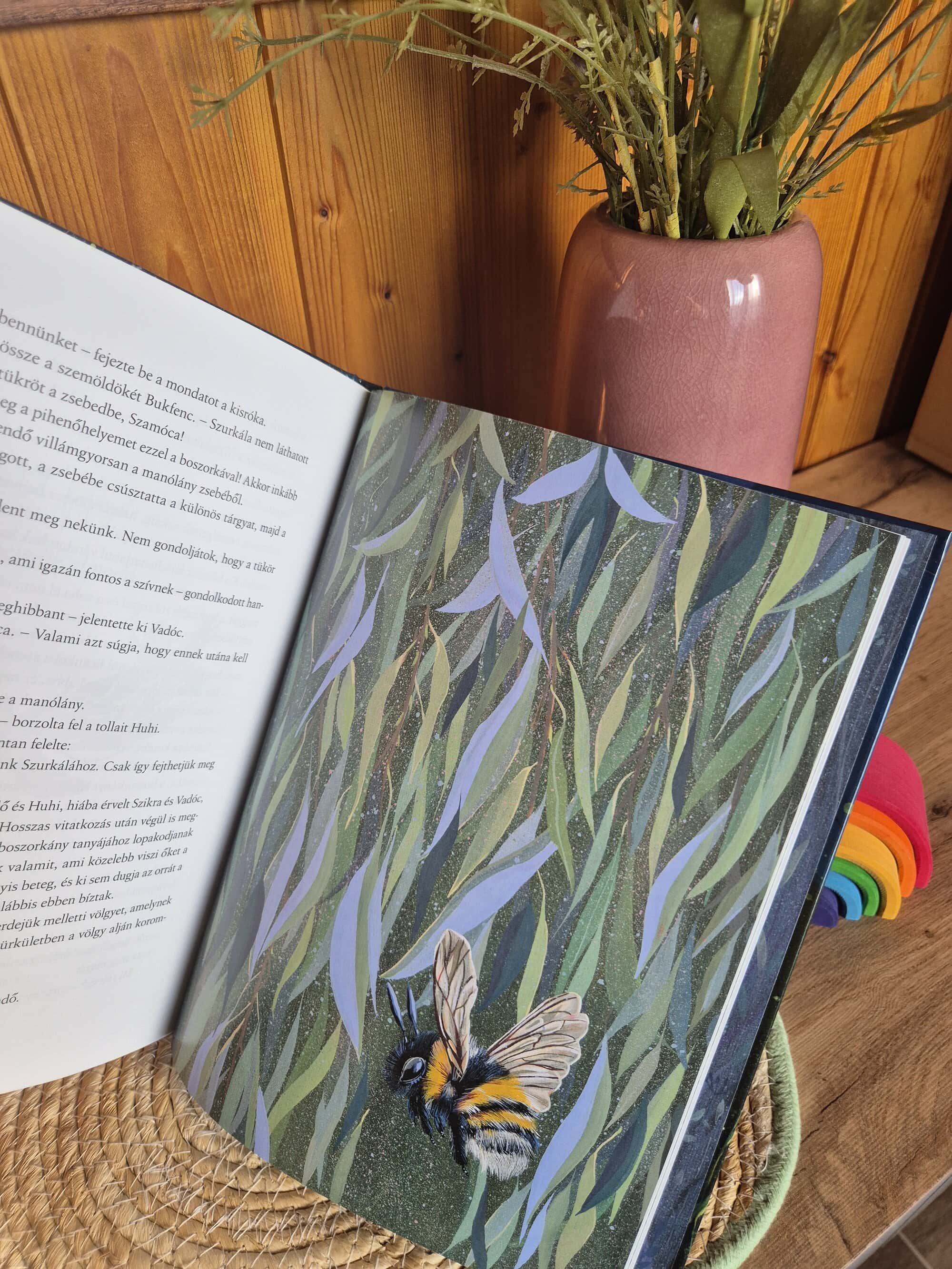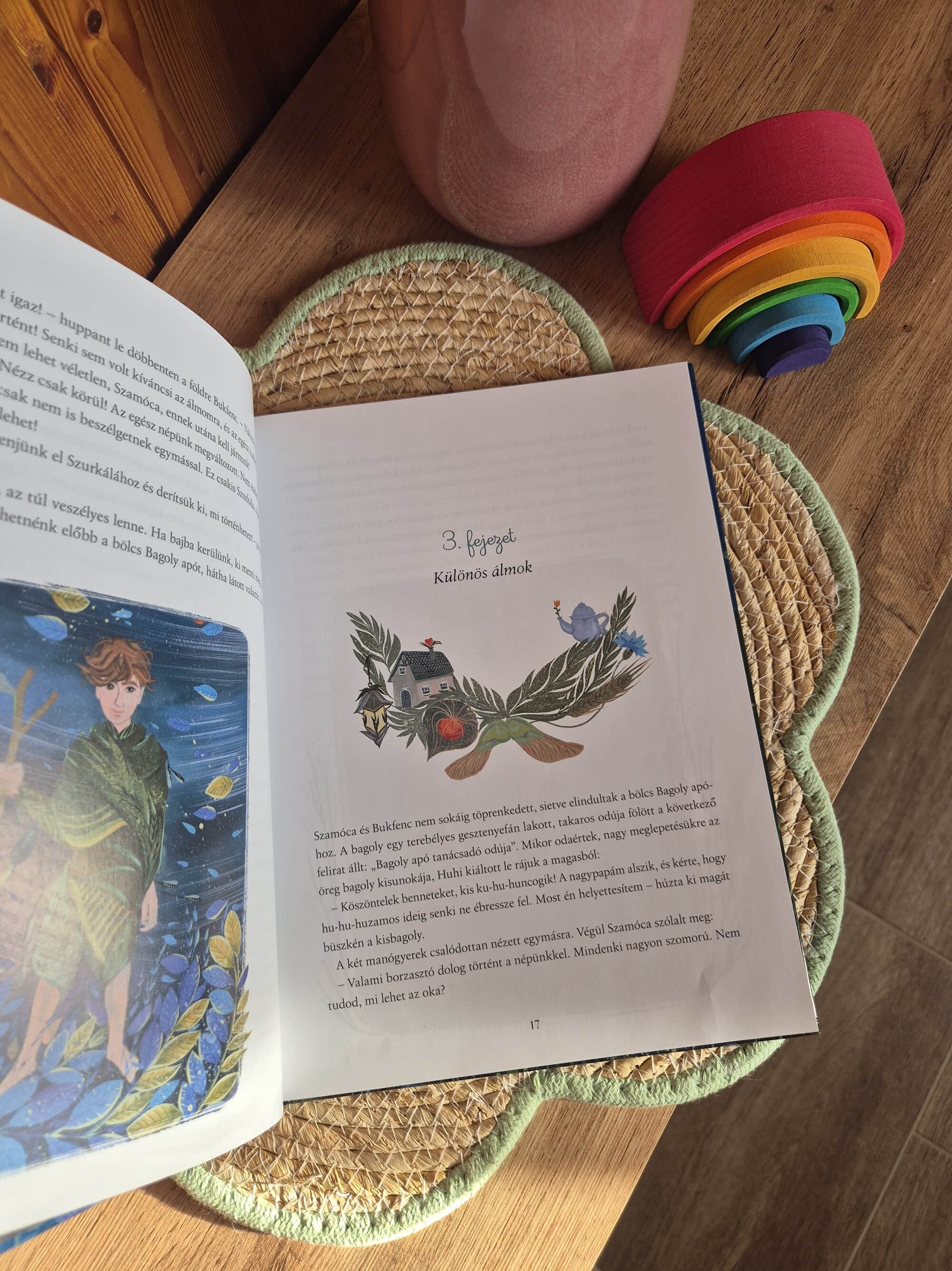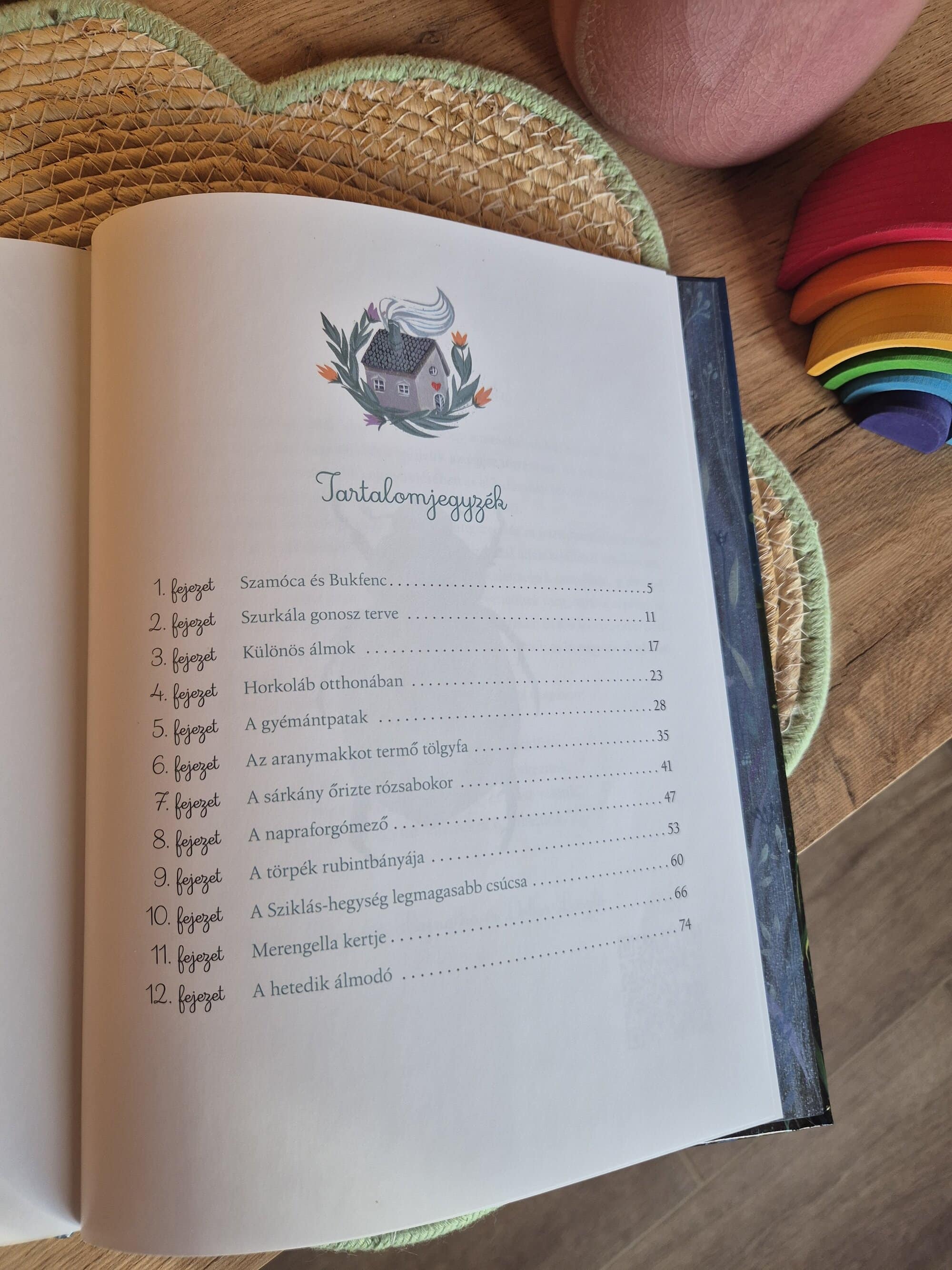 A barátoknak izgalmas próbatételeken keresztül kell varázstárgyakat gyűjteniük, miközben még a félelmetesnek tűnő Szurkála boszorkánnyal is találkoznak. Aggodalomra semmi ok, a könyv szuperül oldja fel a gyermeki félelmeket, és minden kaland egy nagyon szép, megnyugtató lezárást kap. Hegedűs Hajnalka kézzel festett, művészi illusztrációi egyszerűen gyönyörűek, és tökéletesen megteremtik ezt a békés, "lelassult" mesevilágot. Ráadásként még vidám, fülbemászó dalok is készültek a mesékhez, amiket a YouTube-on bekapcsolhattok az esti közös olvasások mellé!