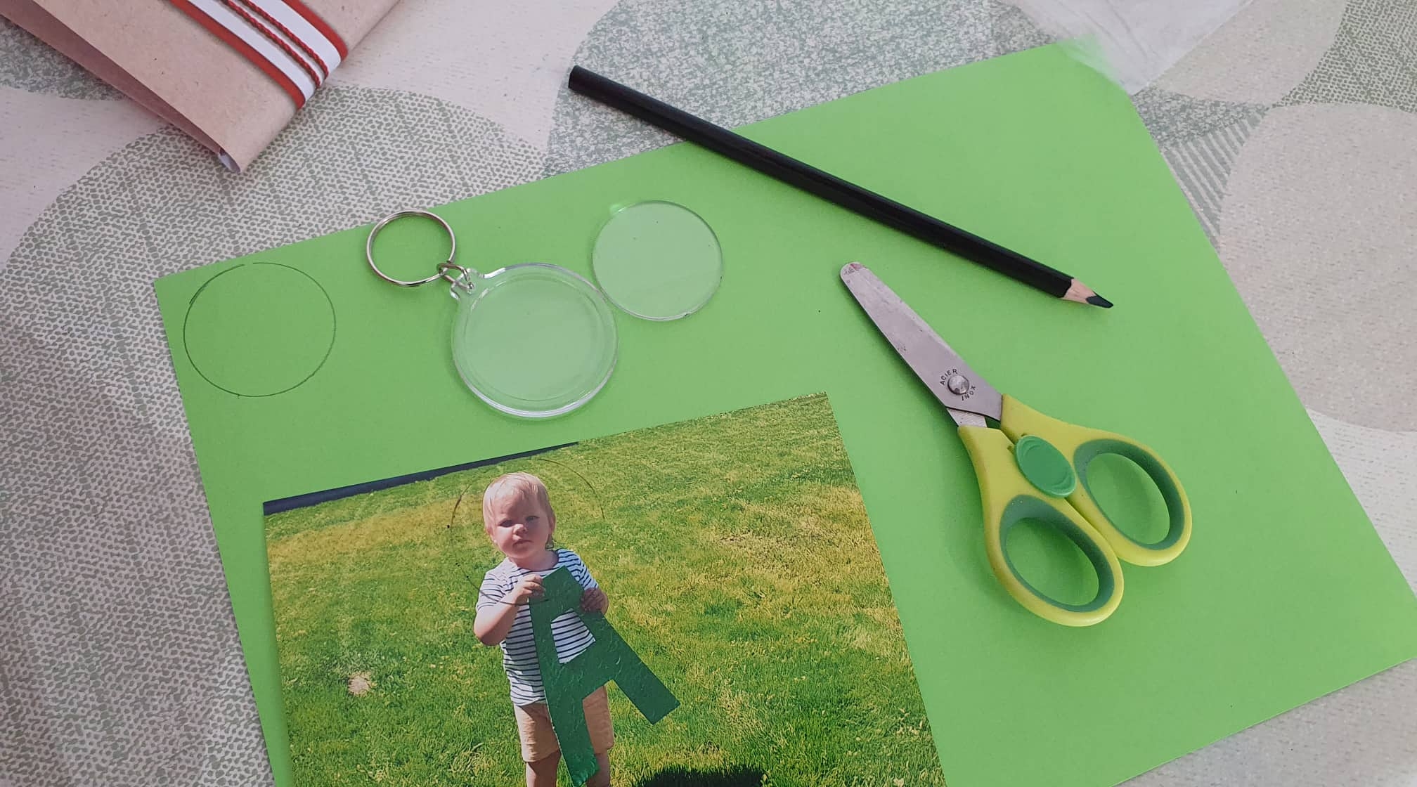 1. Először is előkészítettem az összes alapanyagot, majd mind a kartonpapírt, mind a fényképet körberajzoltam a kulcstartó kör alapjában felhasználásával.