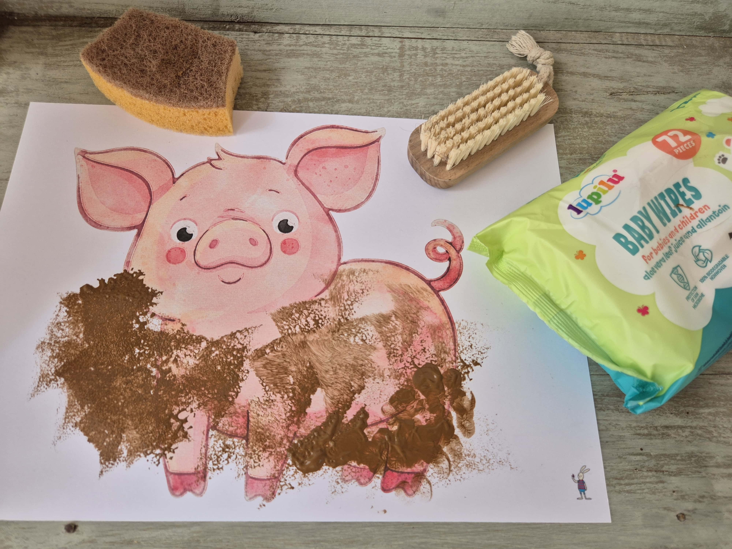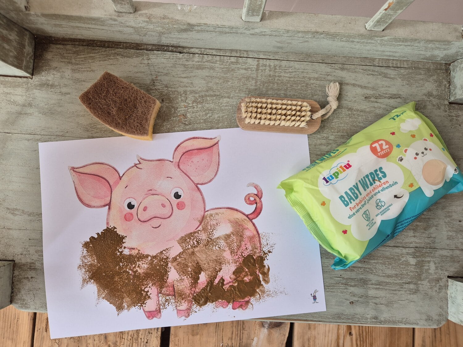 Ha már jól összekentünk a malackákat, akkor „fürdessük” is meg őket! Elegendő ehhez egy kis bevizezett szivacs és/vagy pici kefe, amivel mehet is a tisztogatás!
