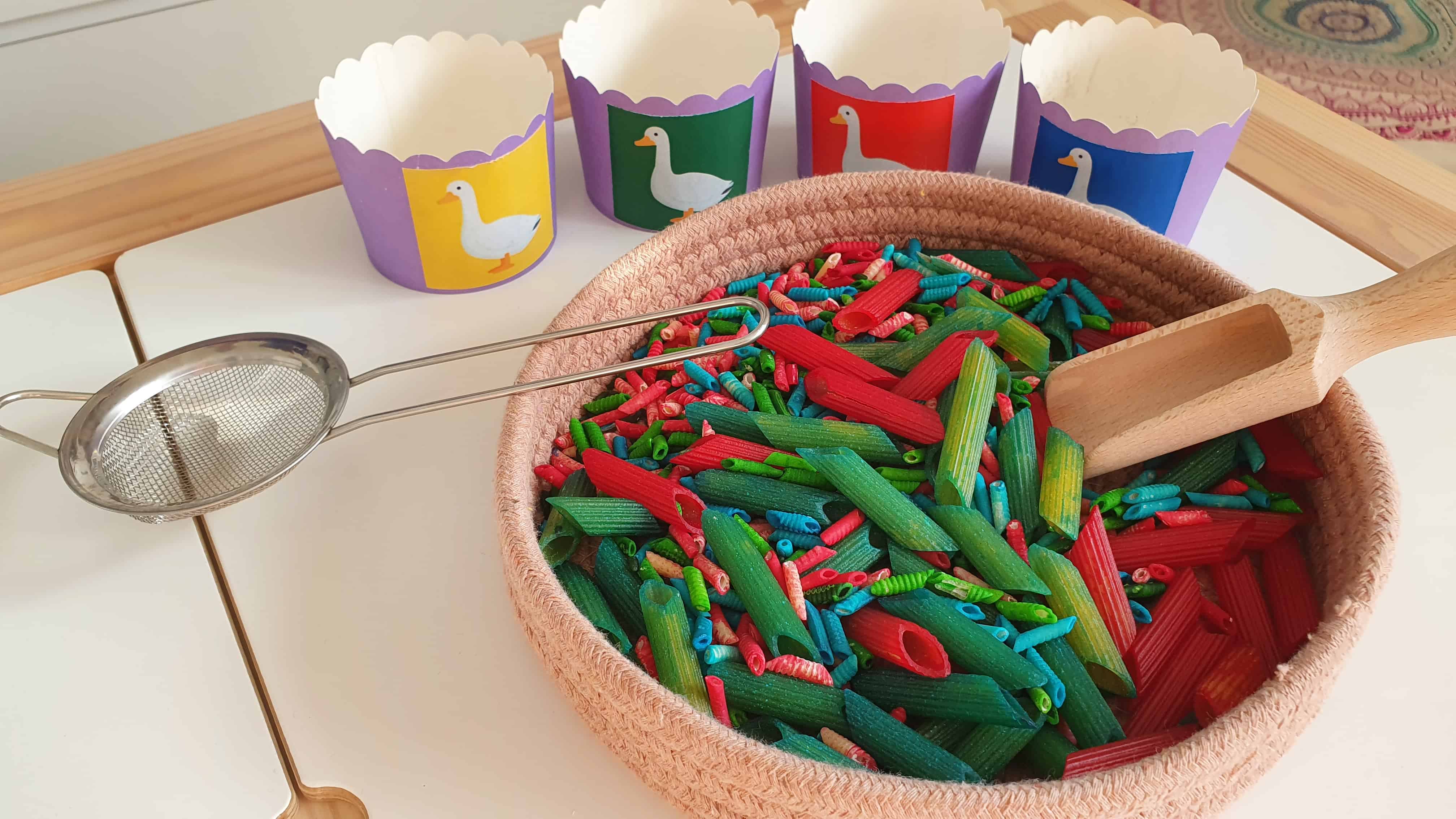 A libák mindent szeretnek, ami a hátterükhöz passzoló színű, mi pl finom, színes tésztákkal etettük meg őket.