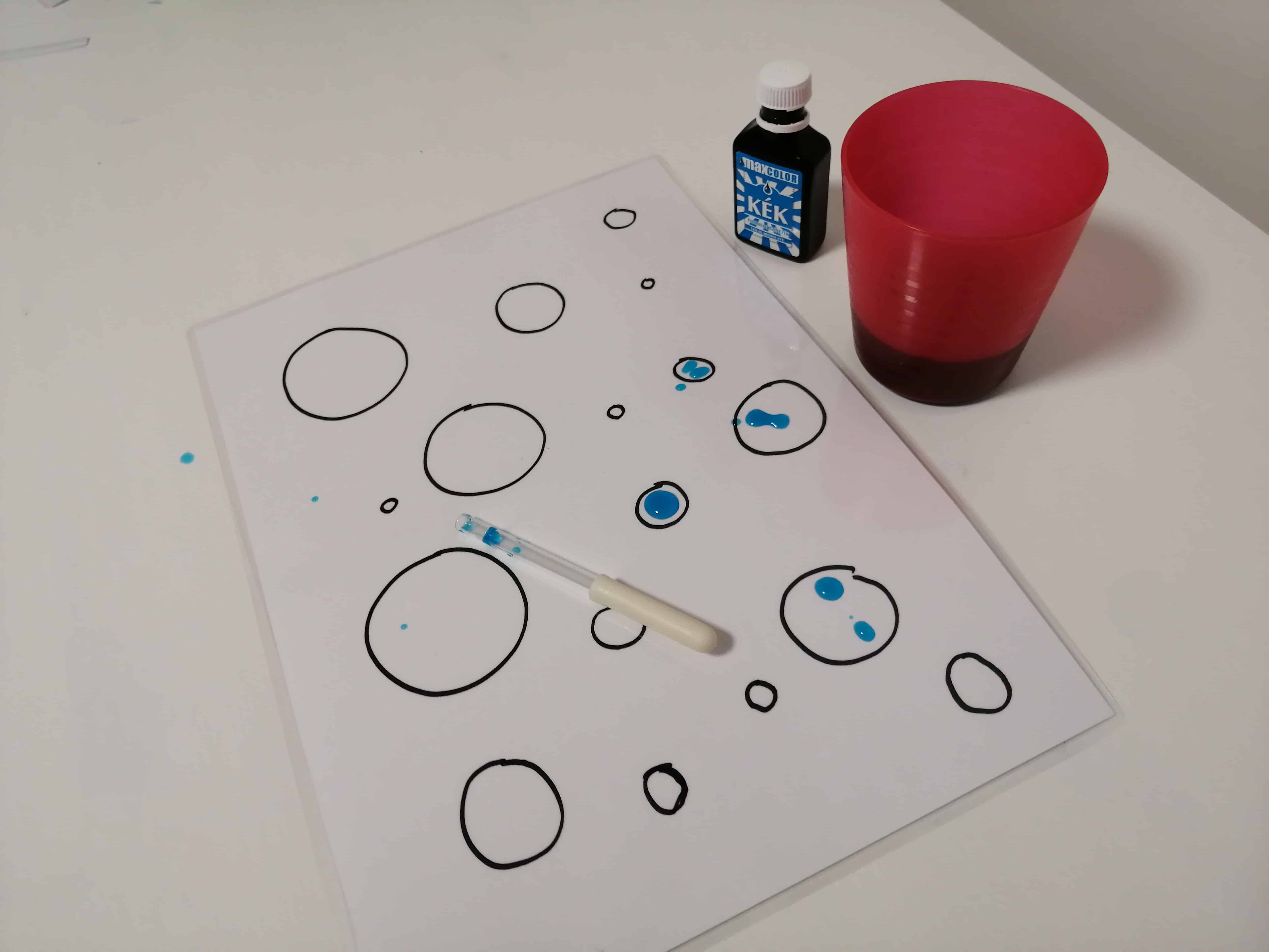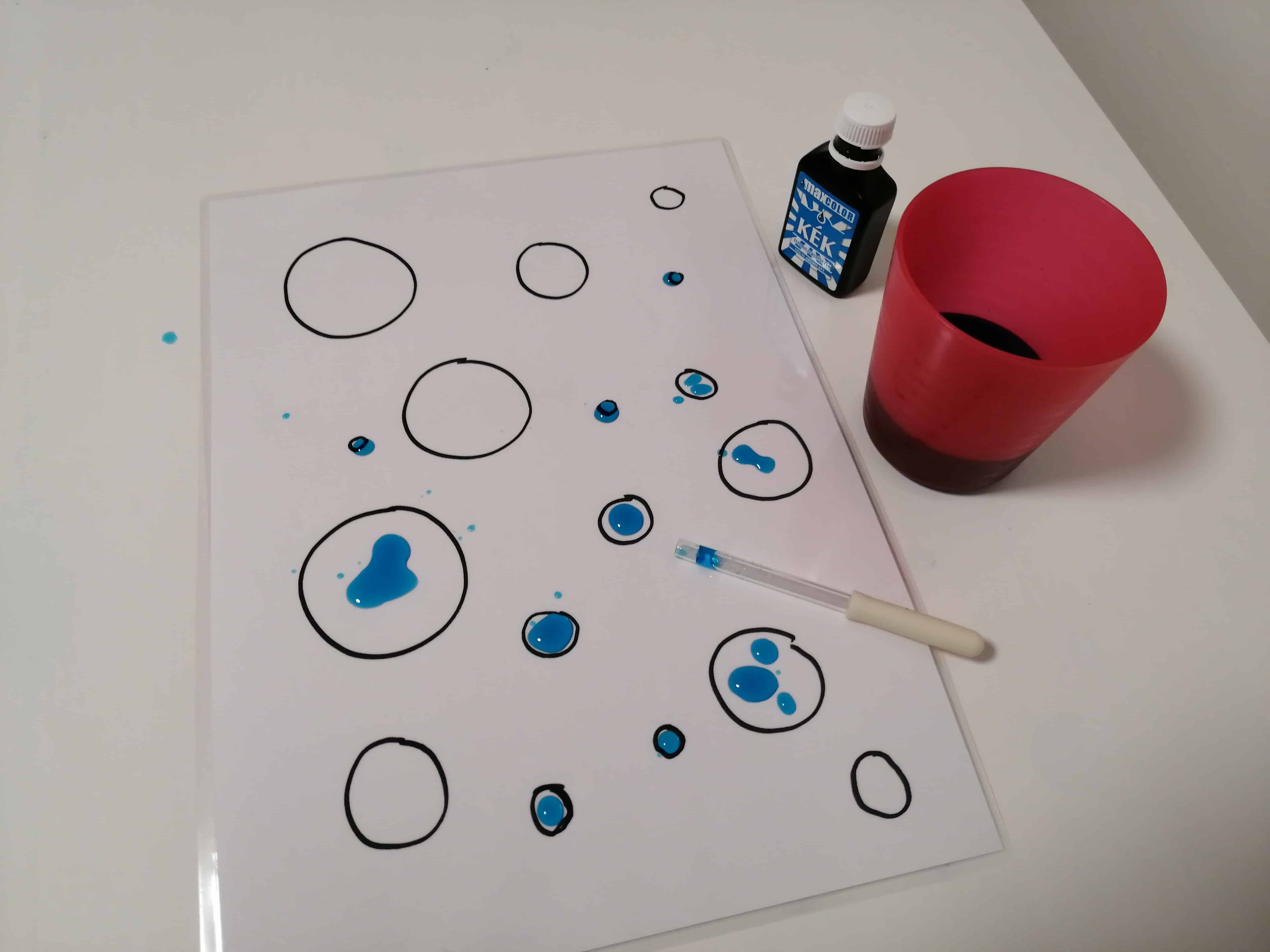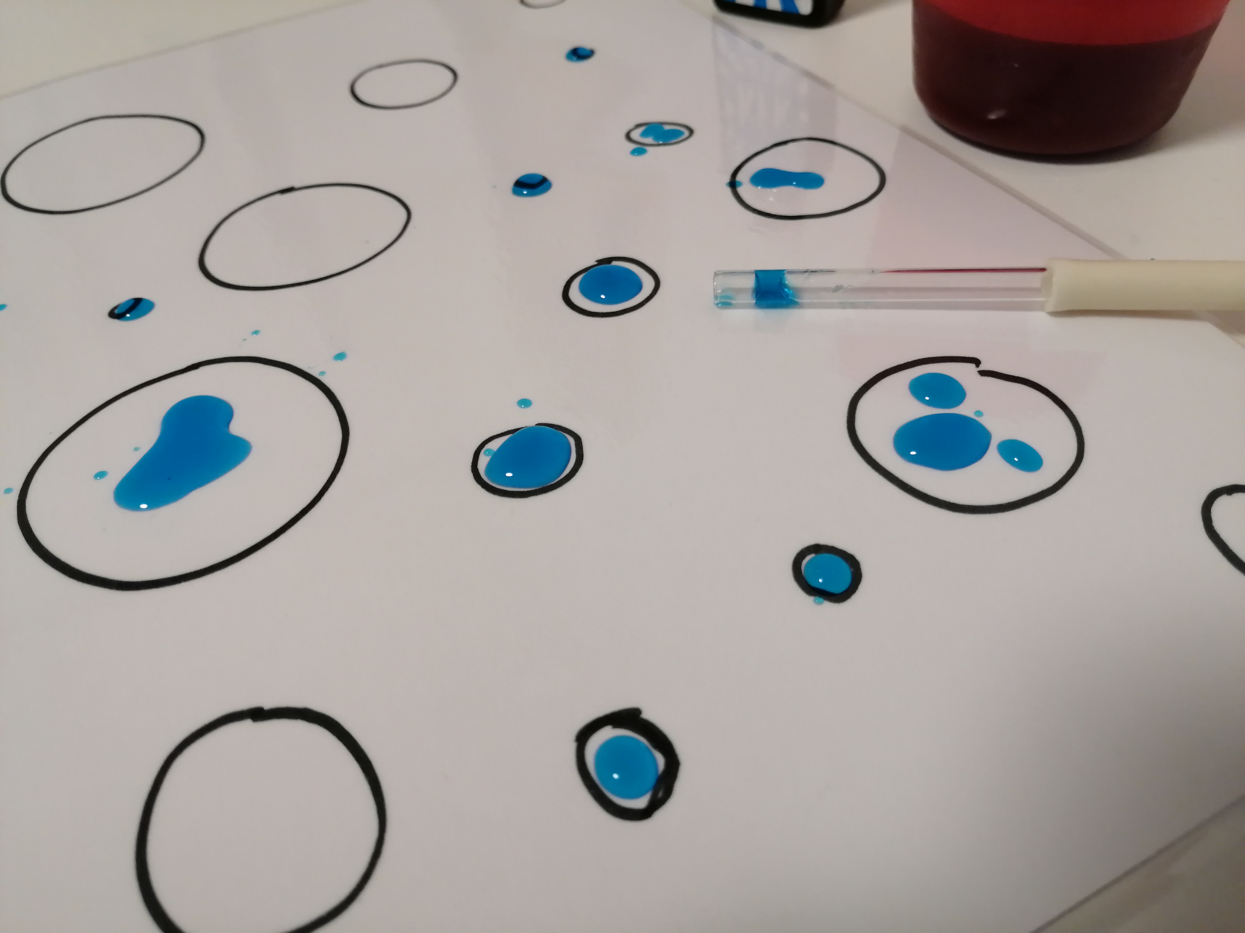 Kis karikákat rajzoltam egy fehér műszaki rajzlapra, majd lelamináltam azt. Ha Neked nincs laminálód, nyugodtan tedd a lapot egy irattartó bugyiba. Ezután megszíneztem a vizet egy pici kékkel és kezdődhet is a móka! A pipettával, csippentő mozdulattal felszívunk egy kis vizet, majd megpróbáljuk a megfelelő helyre (a karikába) belecseppenteni a felszívott folyadékot.