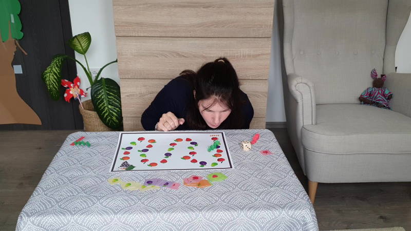 Ovisoknak ( 4év+) – Dobjatok a szám dobókockával és fújjátok vagy tegyétek a hernyót a megfelelő számú gyümölcsre. Ha ez sikerül, gazdagodtok egy gyümölcs kártyával. A játék akkor ér véget, amikor az összes hernyó célba ért. Ilyenkor összeszámolhatjátok a gyűjtött gyümölcs kártyákat és meg is nevezhetitek őket.
