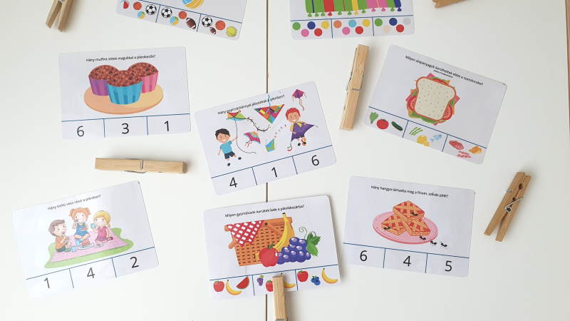 Ebben a játékban a nagyobb, iskolába készülődő ovisok agytekervényeit mozgatjuk meg. Természetesen a tőlünk megszokott, játékos formában, ezúttal a Piknik témaköréhez kapcsolódva. 🙂 Hány süti fogyott el, mit csináltak a hangyák és milyen alapanyagok kellenek egy igazán finom szendvicshez? Ezekre a kérdésekre is választ kaphattok ebben a játékban, amihez csupán a letölthető kártyák + néhány csipesz szükséges.