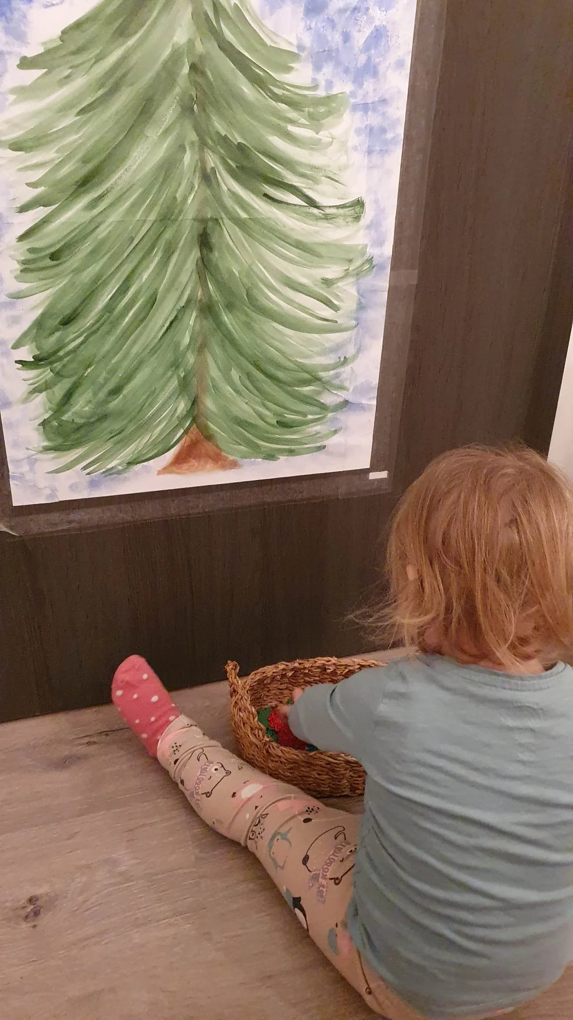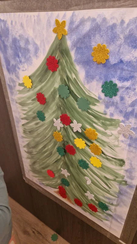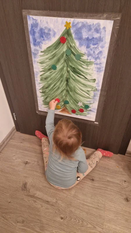 Ehhez a játékhoz a fát én festettem A3 méretben, de ha Te szeretnél bíbelődni a festéssel, akkor használhatjátok a karácsonyfa óriás színezőnket vagy a Díszítsük fel a karácsonyfát! játékunkból a fenyőfa sablont is.