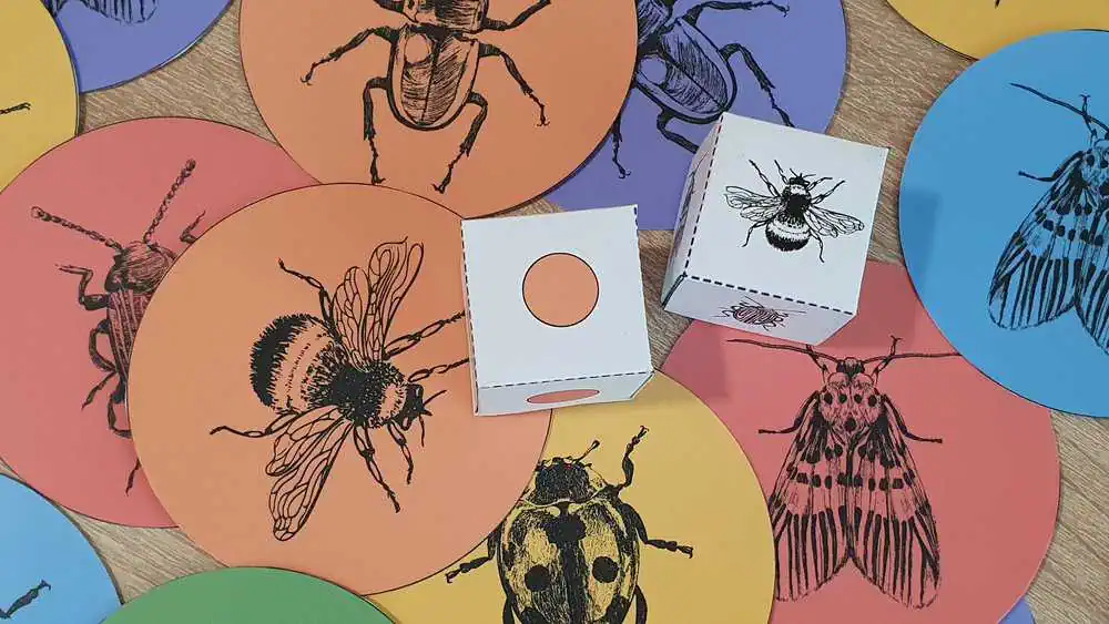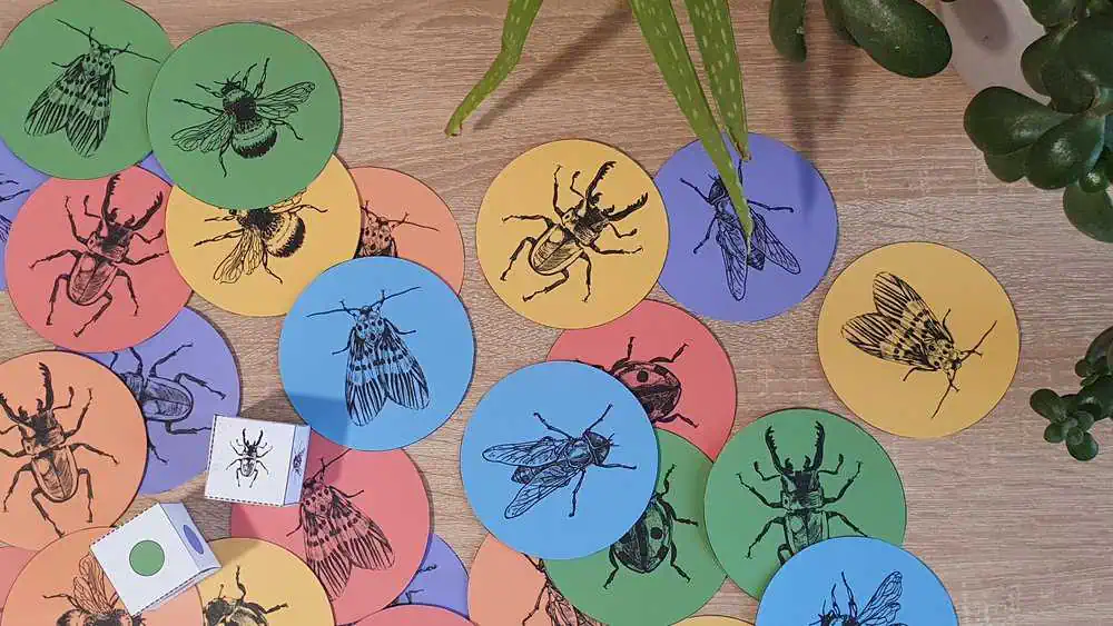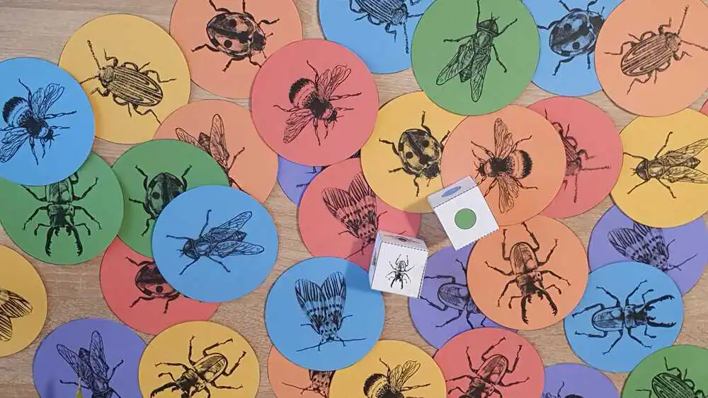 A kártyákon részletes grafikával ellátott rovarokat láthattok, amelyeket szín-és formaegyeztetéssel tudtok megtalálni a dobókockákkal dobott szín-és forma szerint.