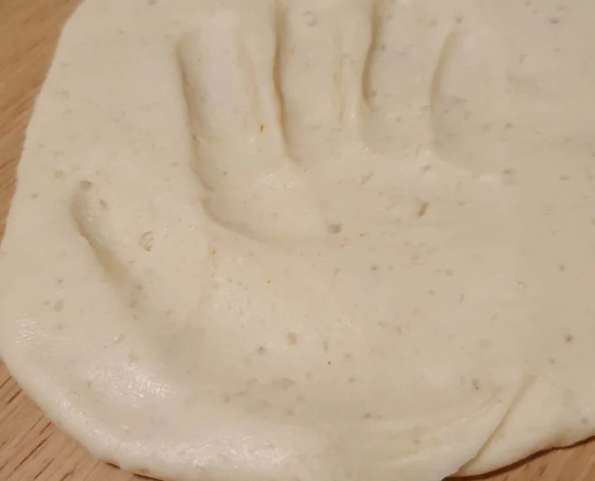 1. Kisodorjuk az elkészített gyurmát. Ezután belenyomjuk a kicsik kezét.