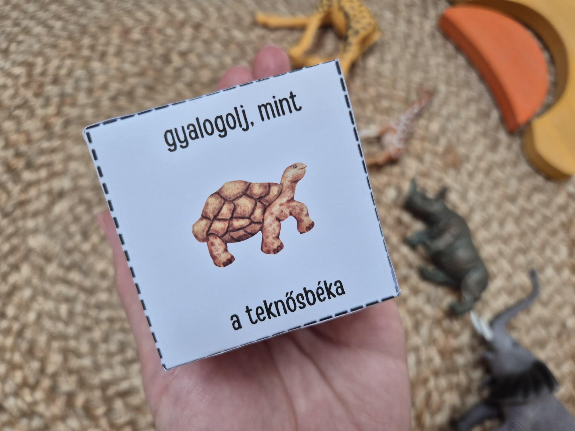 – Először dobtok azzal a dobókockával, amelyen a szavannai állatok vannak, majd a cselekvés gyorsaságát meghatározó kockával is. – A kettő kocka kombinációjából kapott kis feladatot kell aztán megcsinálni ügyesen, mozogva. Pl: Trappolj mint egy elefánt, de lassan! :)