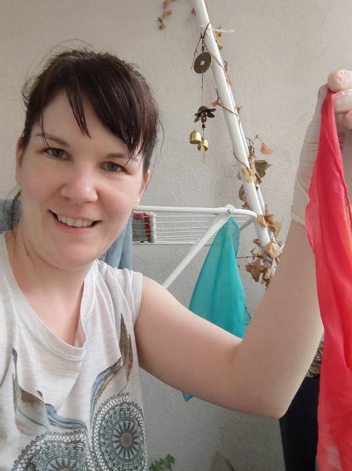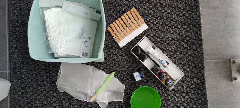 Tegyétek a selymet/textilpelust egy tálcára, és öntsetek rá egy kis ételfestéket, majd figyeljétek meg, ahogy átitatódik az anyag. Gumikesztyűs kézzel kicsit össze lehet morzsolni az anyagot, így segítve, hogy jobban beszívódjon a festék. A szárításhoz pedig egy csipesszel fel tudjátok tenni bármilyen ruhaszárítóra.