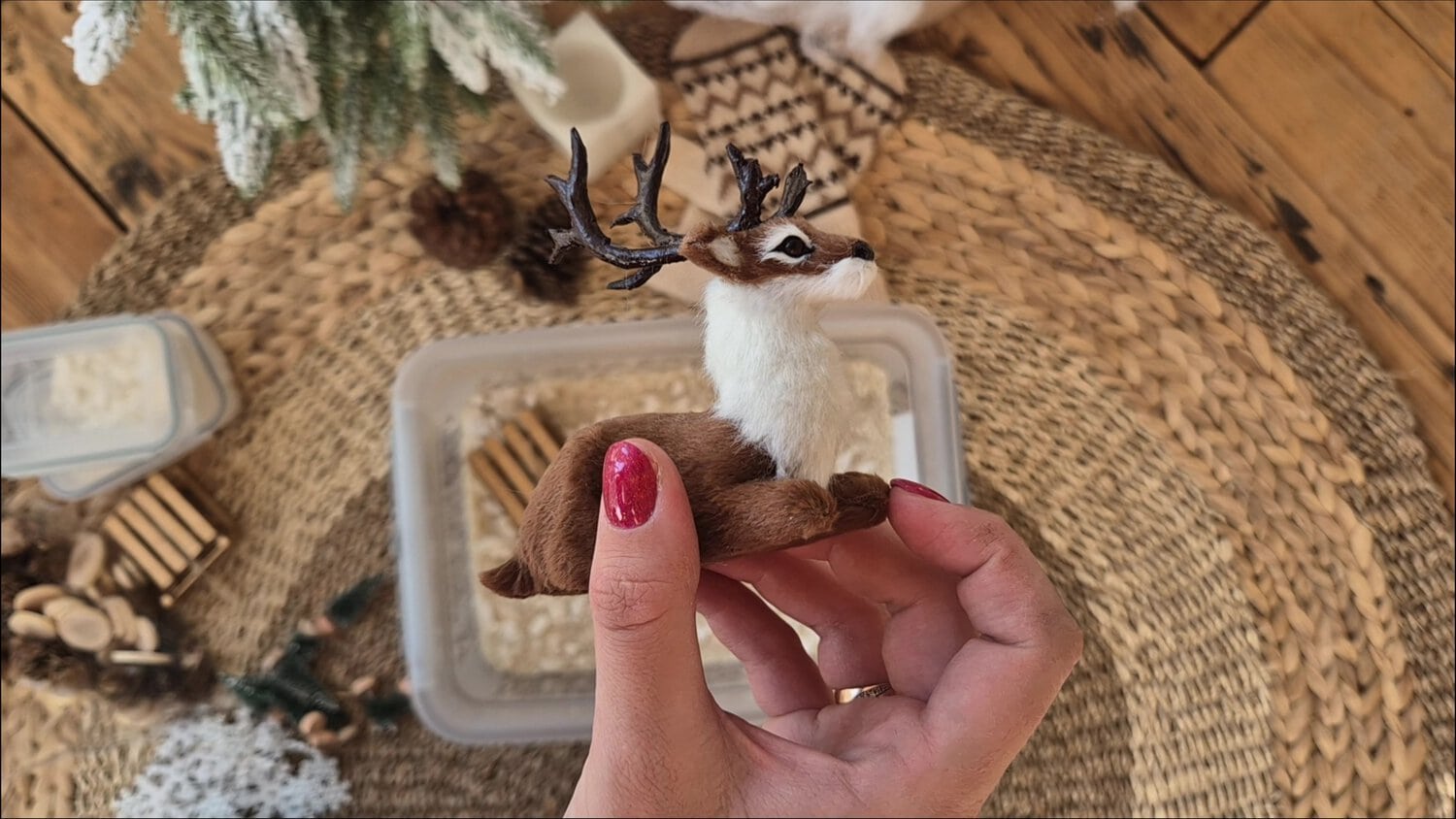 Téli világ turkadoboz szarvassal, szánkóval