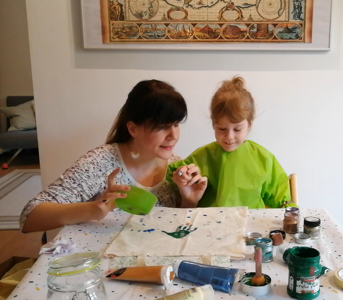 Felhasznált alapanyagok: textiltáska, matt akrilfesték (lehet textilfesték is), szivacsecset vagy szivacsdarab, egy cuki kéz :)