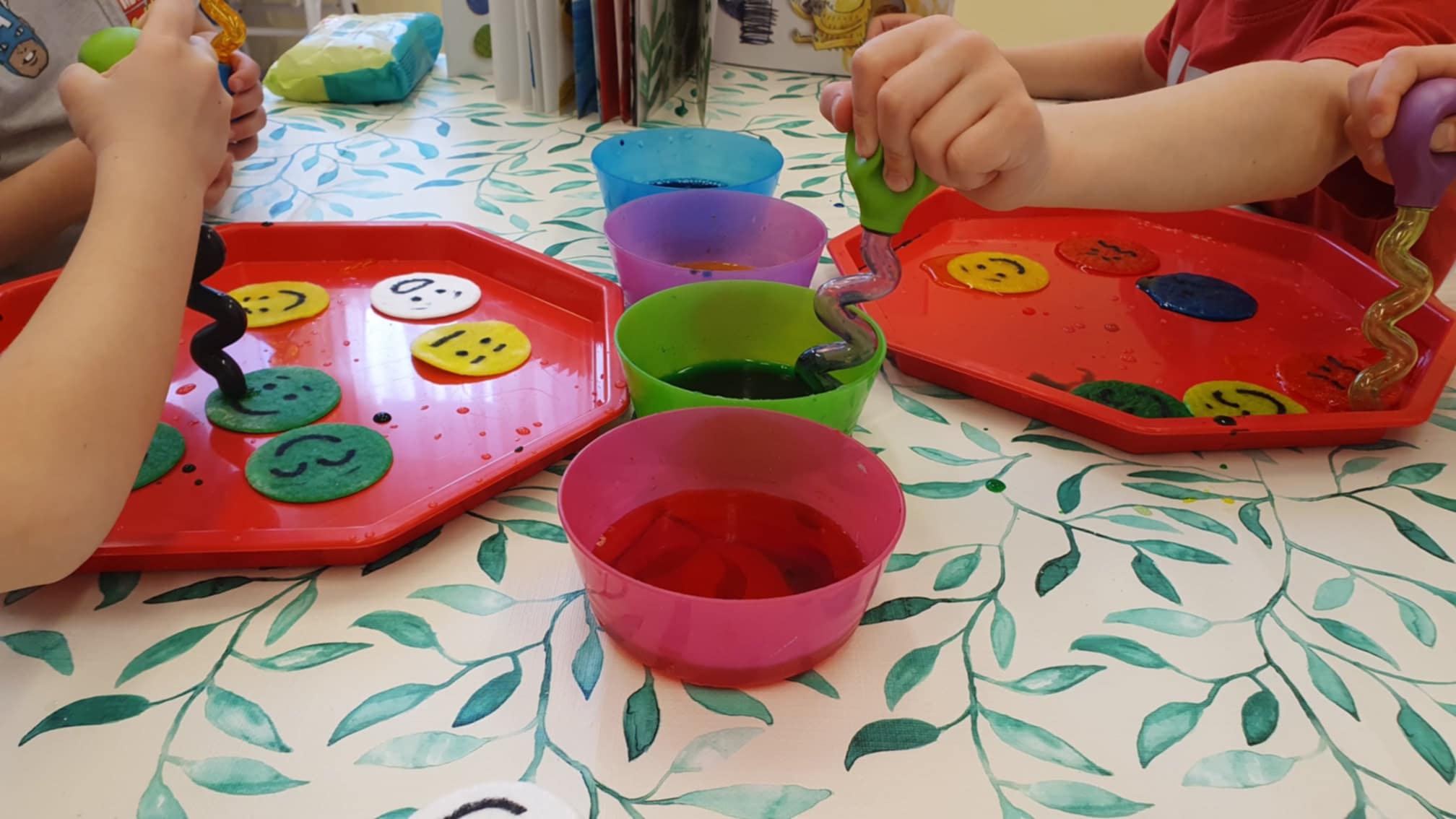 A gyerekek megszínezték az egyes korongokat az érzelmi állapotnak megfelelő színnel, majd játékos kísérleteket is végeztek – mi történik, ha az egyes érzelmi állapotok keverednek? Ehhez összeérintették a befestett korongokat és megtörtént a varázslat! Az egyes korogok egymást is beszínezték. Próbáljátok ki Ti is!